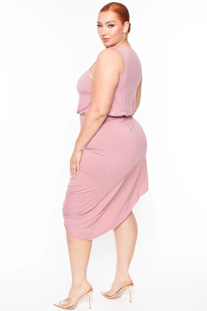 This plus size, stretch knit dress features a round neckline, a sleeveless cut, an elasticized waist with light pleating, drape ability, and an irregular hemline.Â