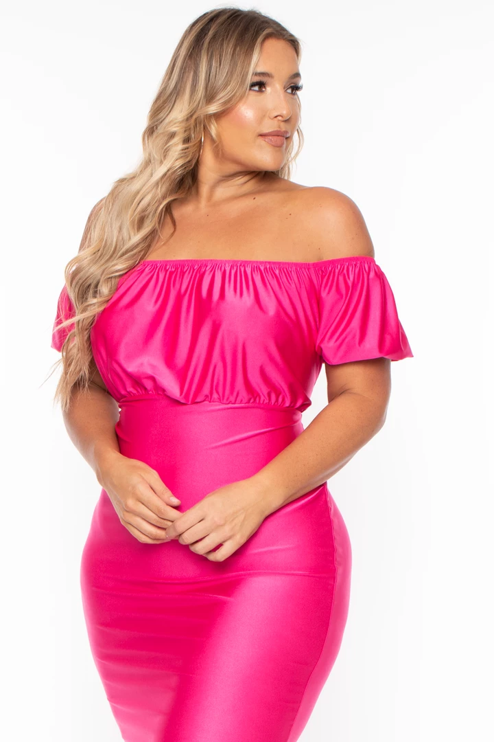 This plus size, stretch knit dress features an elasticized off the shoulder neckline, short sleeves with elasticized hem, pleated detail on bodice, midi length, and a form fitting bodycon sillouhete.