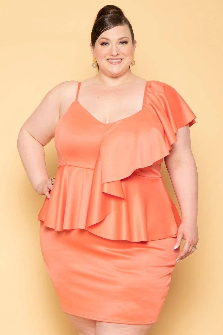 This plus size stretch scuba dress features a v-neckline, one adjustable cami strap, one elasticized short ruffle sleeve that cascades down to a peplum waist, and a bodycon mini length sillouhete.
