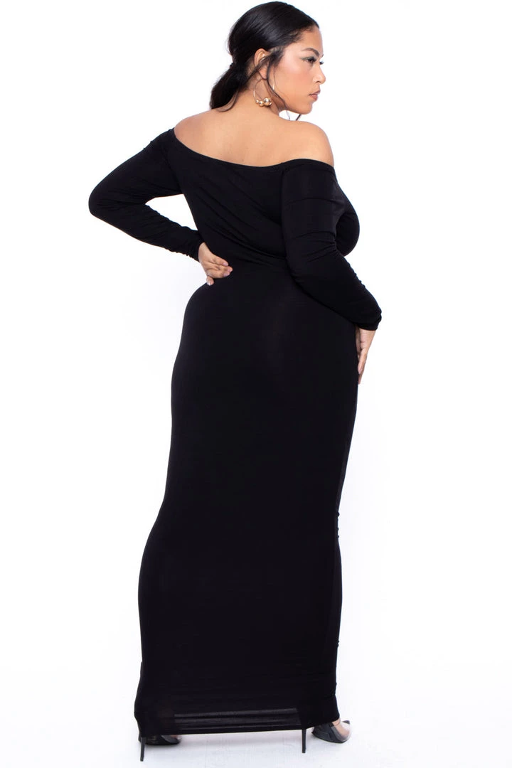 This plus size, stretch knit maxi dress features an elastic off the shoulder neckline, long sleeves, and a bodycon silhouette.