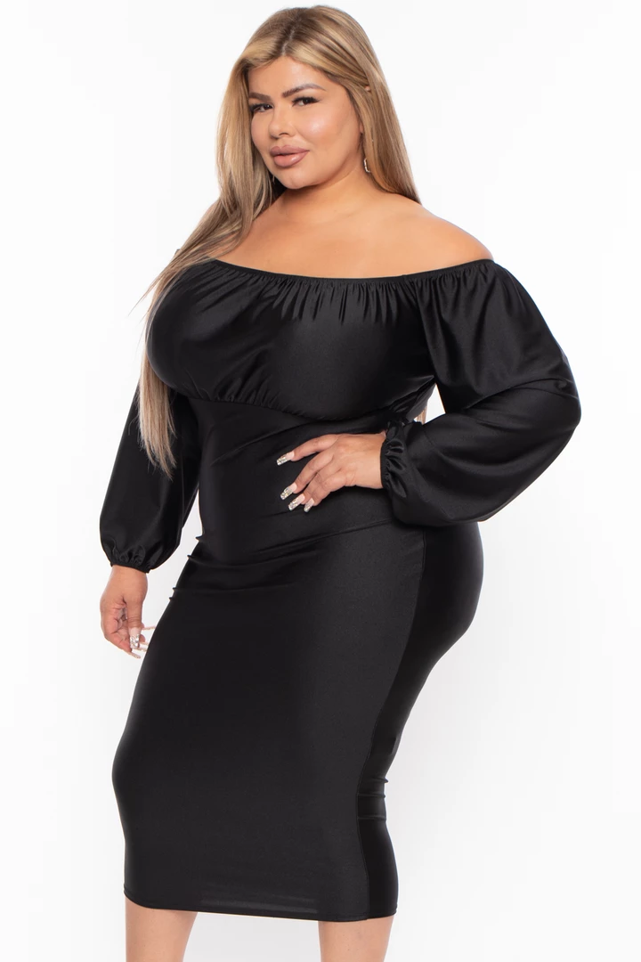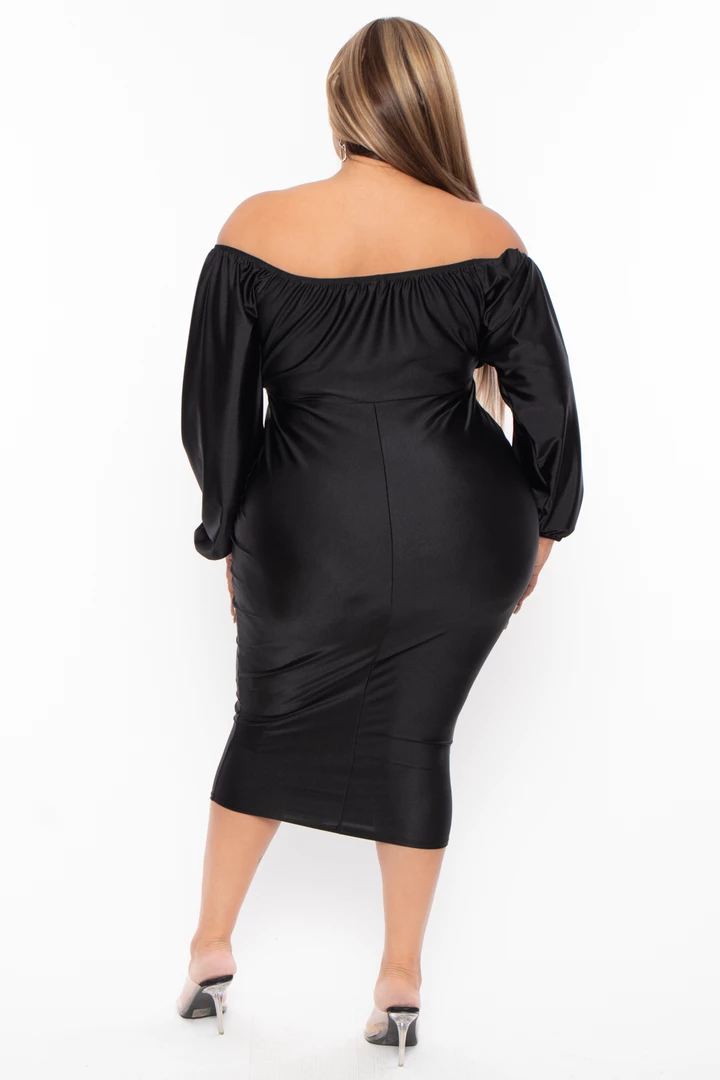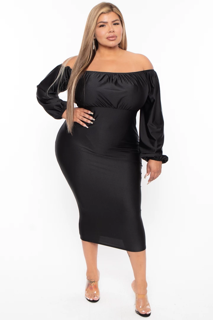 This plus size, woven midi dress features an off the shoulder neckline gathered detail long sleeves with elastic hem a bodycon silhouette, and midi length