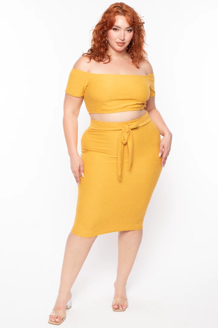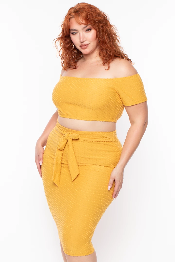 This plus size, stretch knit ribbed two-piece set features an all over textured design, a crop top with an off the shoulder neckline, short sleeves, a matching skirt with an elastic waist and a sash tie belt detail, and form fitting silhouette