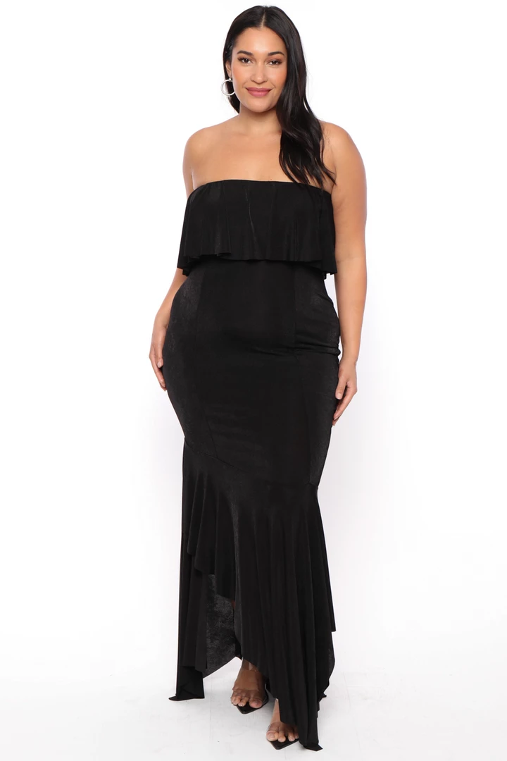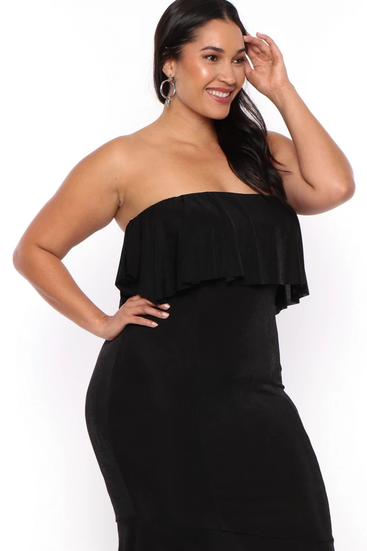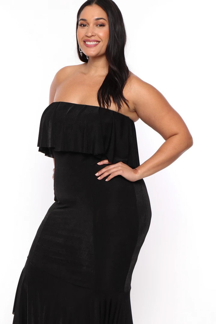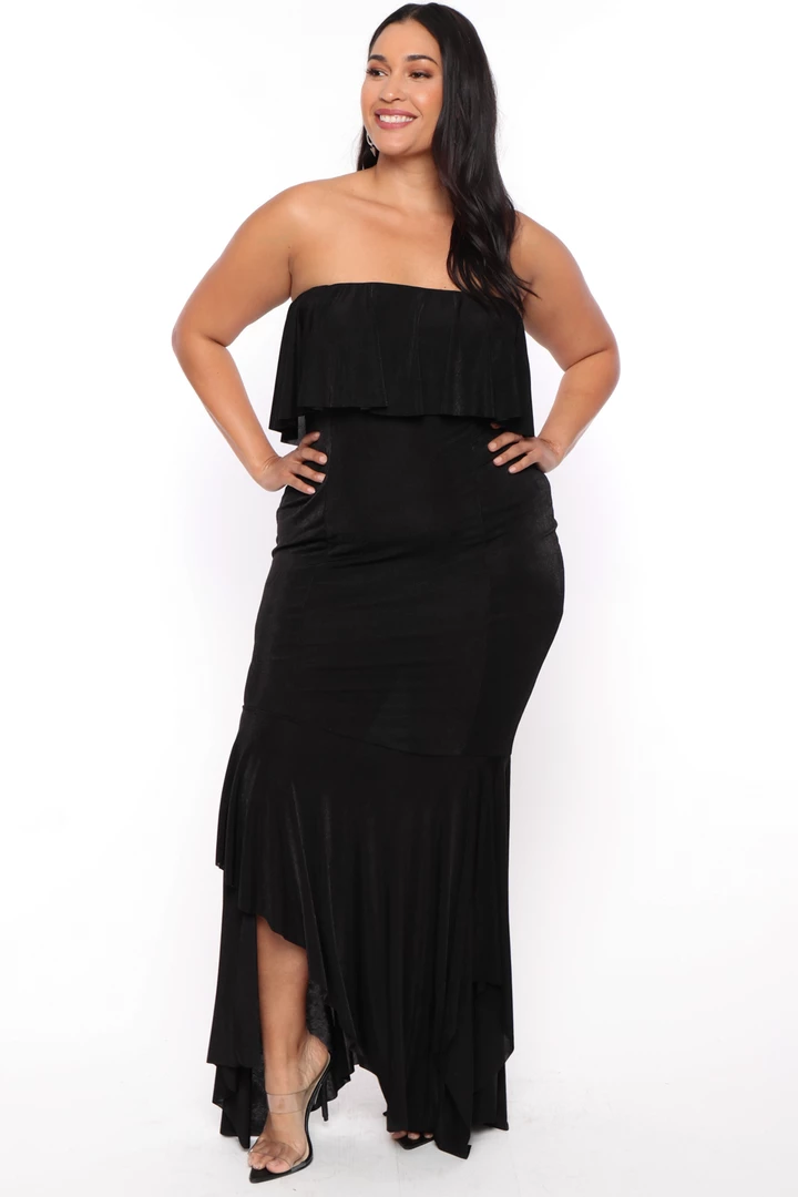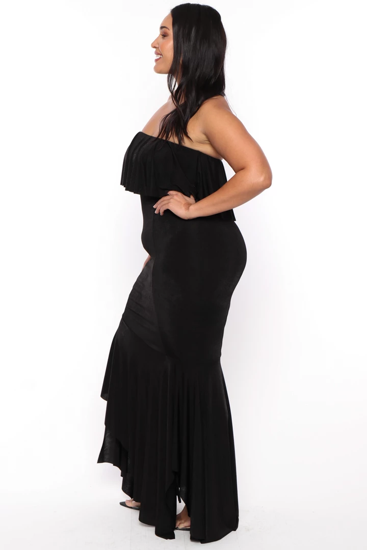 This plus size, stretch slinky knit dress features a strapless ruffle neckline, ruffle flare hem, maxi length, and bodycon silhouette.