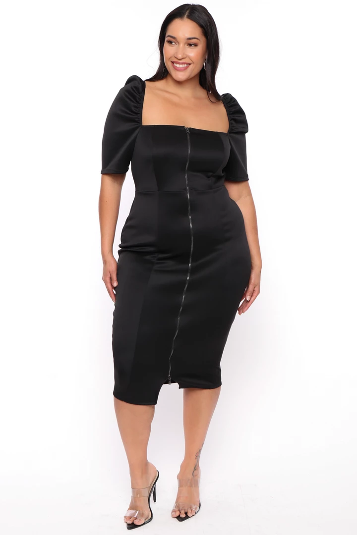 This plus size, stretch dress features an off-shoulder neckline whit short sleeves neckline sleeve are elasticized, an exposed front zipper, and bodycon silhouette dress has a nice block construction and a straight hem