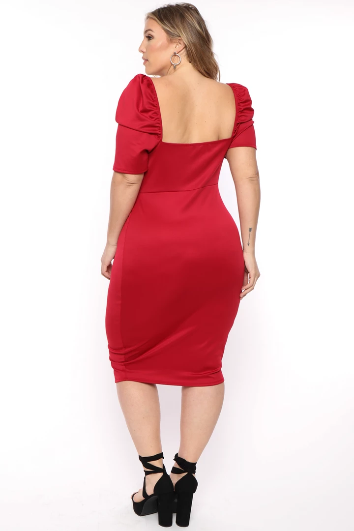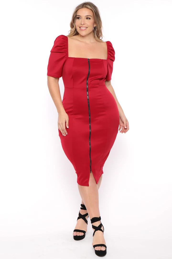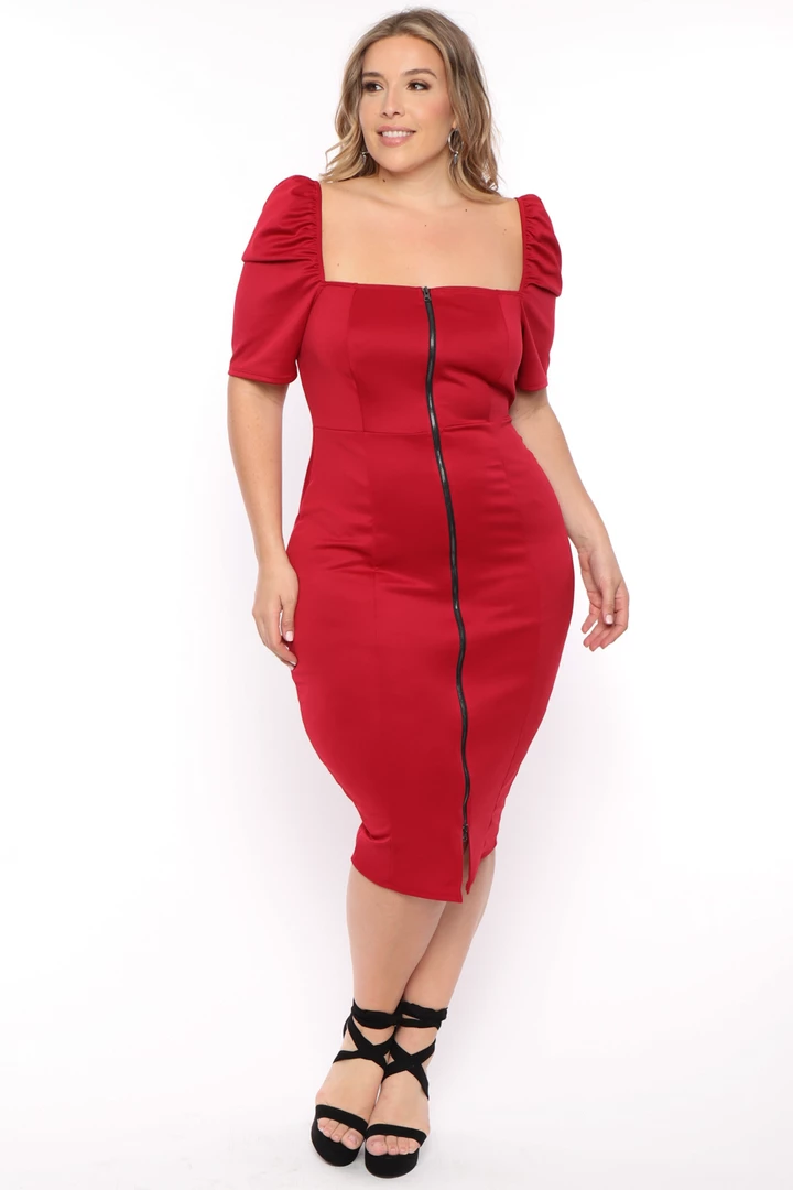 This plus size, stretch dress features an off-shoulder neckline whit short sleeves neckline sleeve are elasticized, an exposed front zipper, and bodycon silhouette dress has a nice block construction and a straight hem