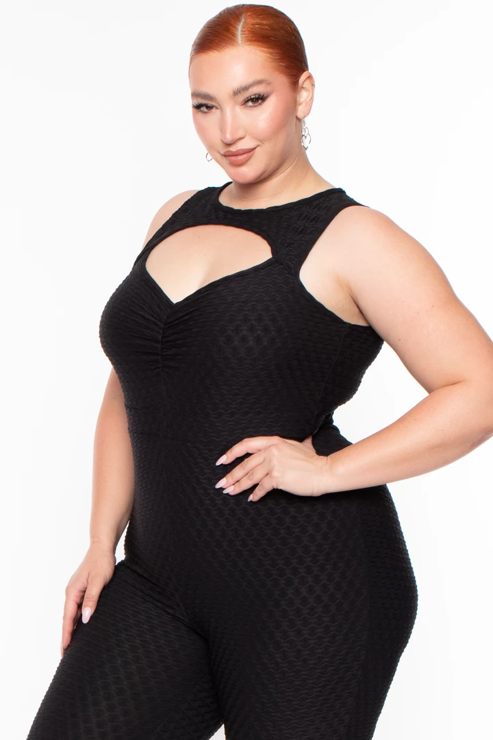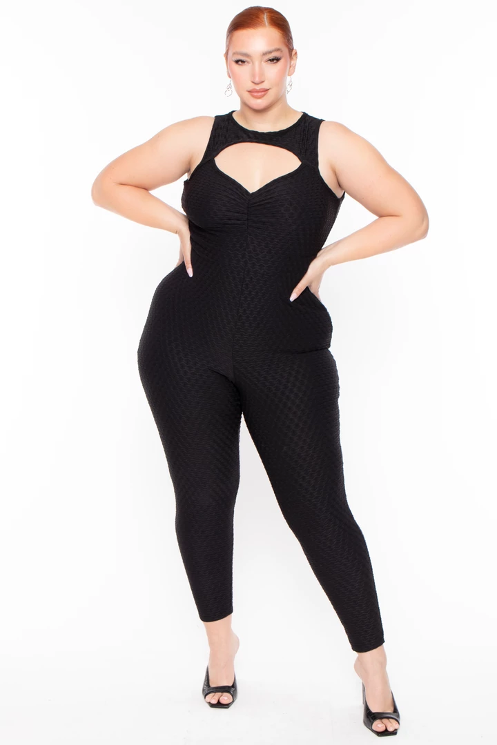 This plus size, jumpsuit features 4 way stretch, textured material all over, keyhole cutout, button closure, ruching on the back of the pants for nice shaping!