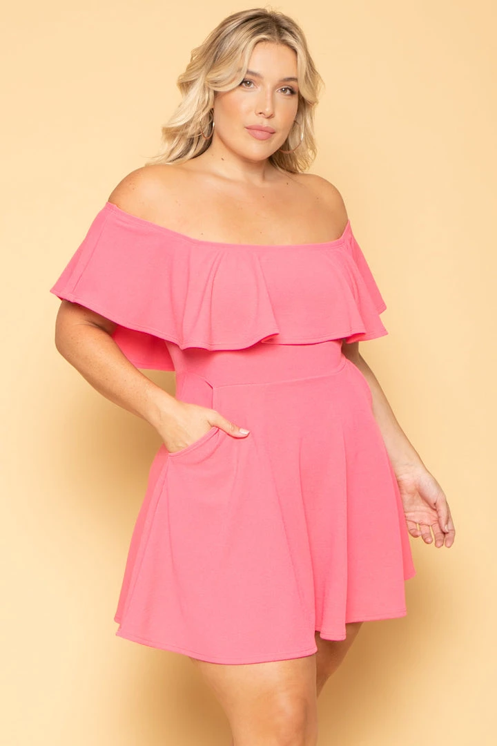 This plus size, textured knit dress features an off the shoulder neckline with a ruffled hem, the dress flares out into a flirty A-line with ruffled hem and has pockets.