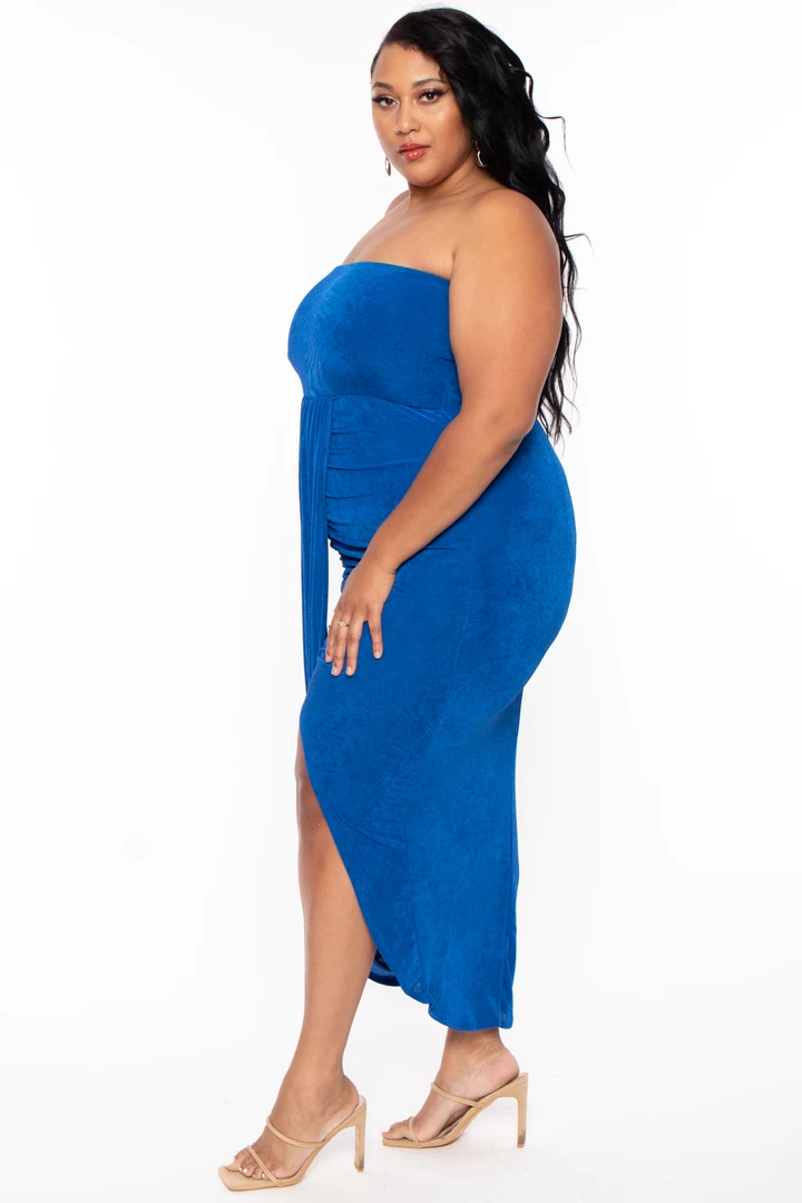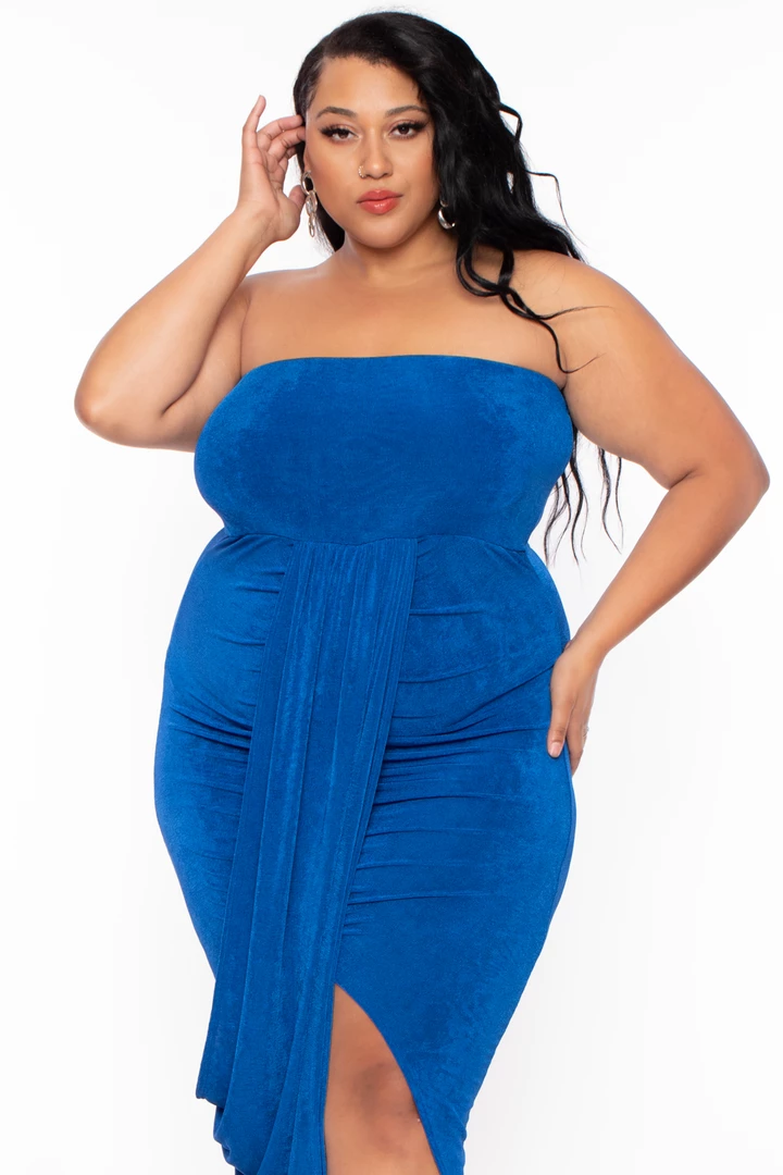 This plus size stretch knit slinky dress features a tube neckline, gorgeous front drape detail that runs down to the side leg, front ruching, front slit, and a bodycon midi length sillouhete.