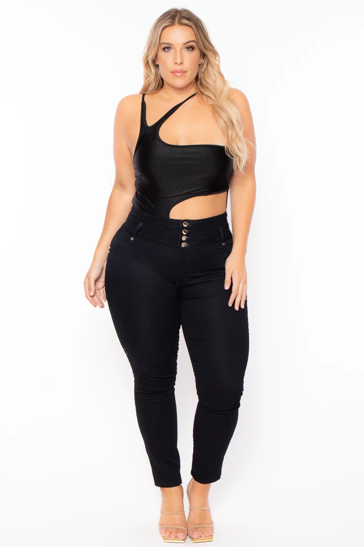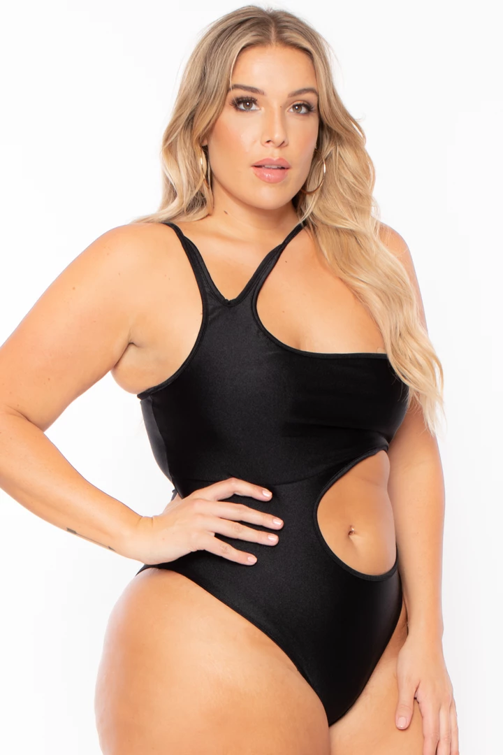 This plus size stretch one-piece suit is designed to be worn as a swimsuit but even better to wear as a bodysuit that can be dressed up from the pool to a night out this suit futures an asymmetric neckline double shoulder strap with keyhole detail and side front sexy cut-out detailÂ