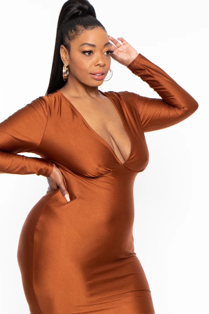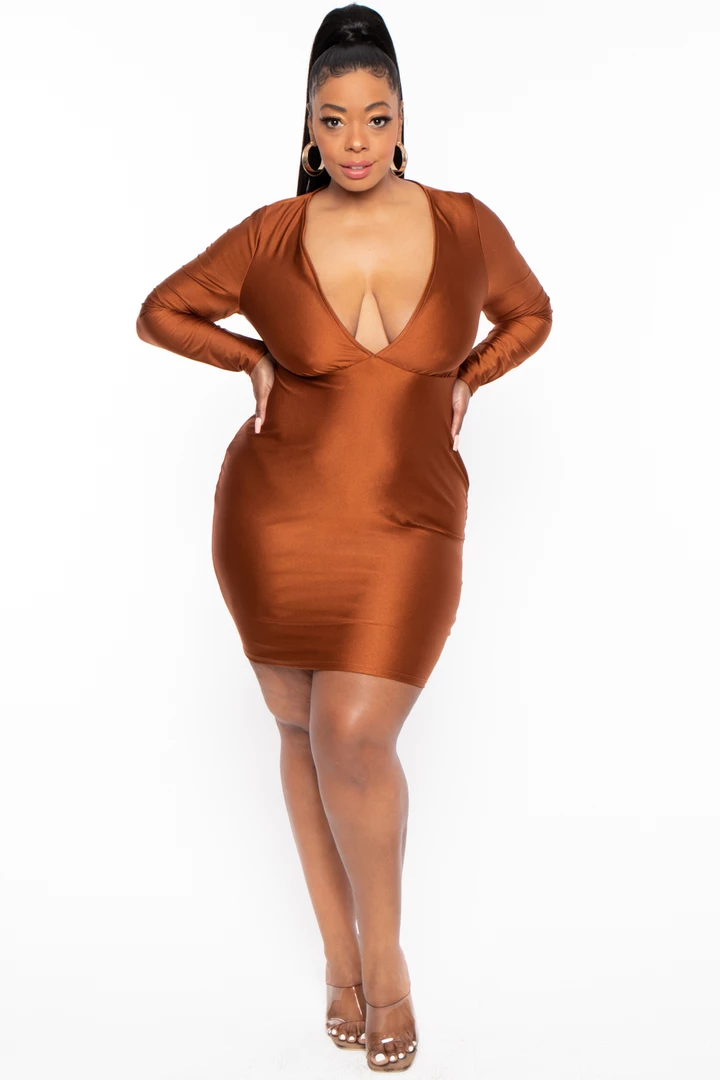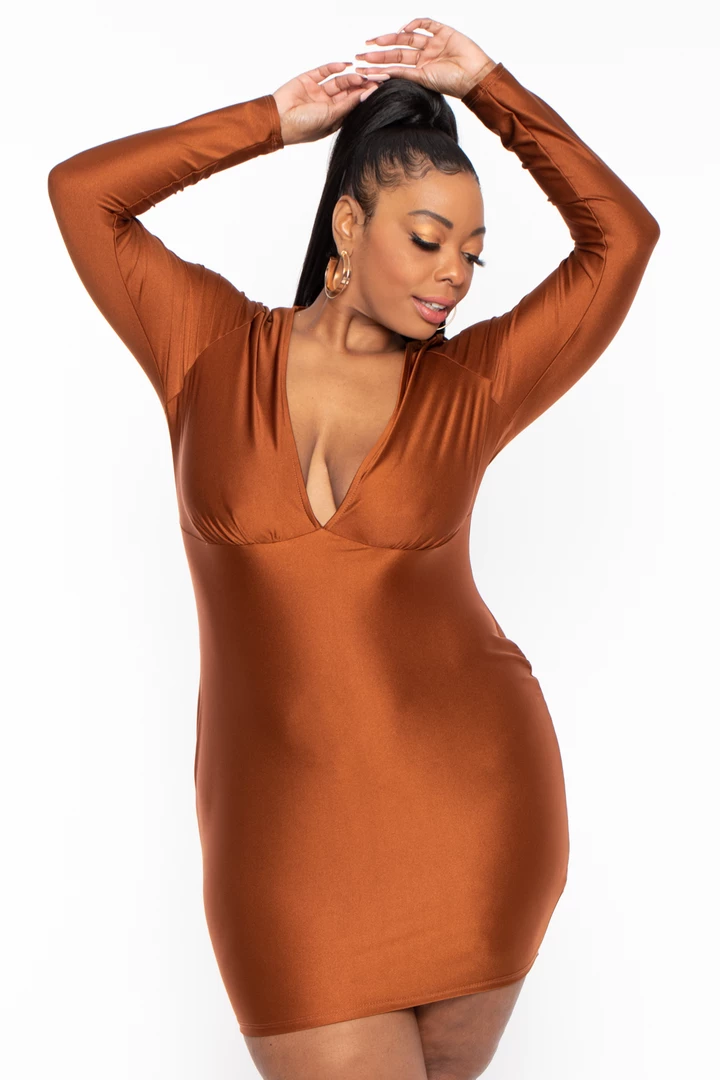 This plus size, stretch mini dress features a plunging neckline shirred detail at center front long sleeves, and bodycon silhouette