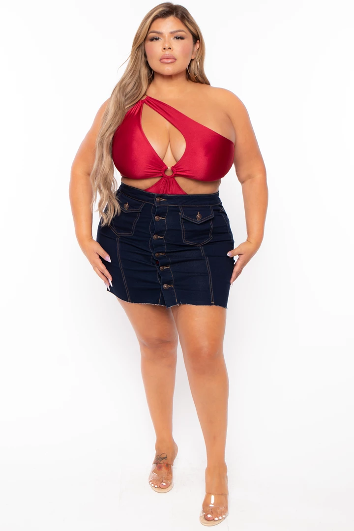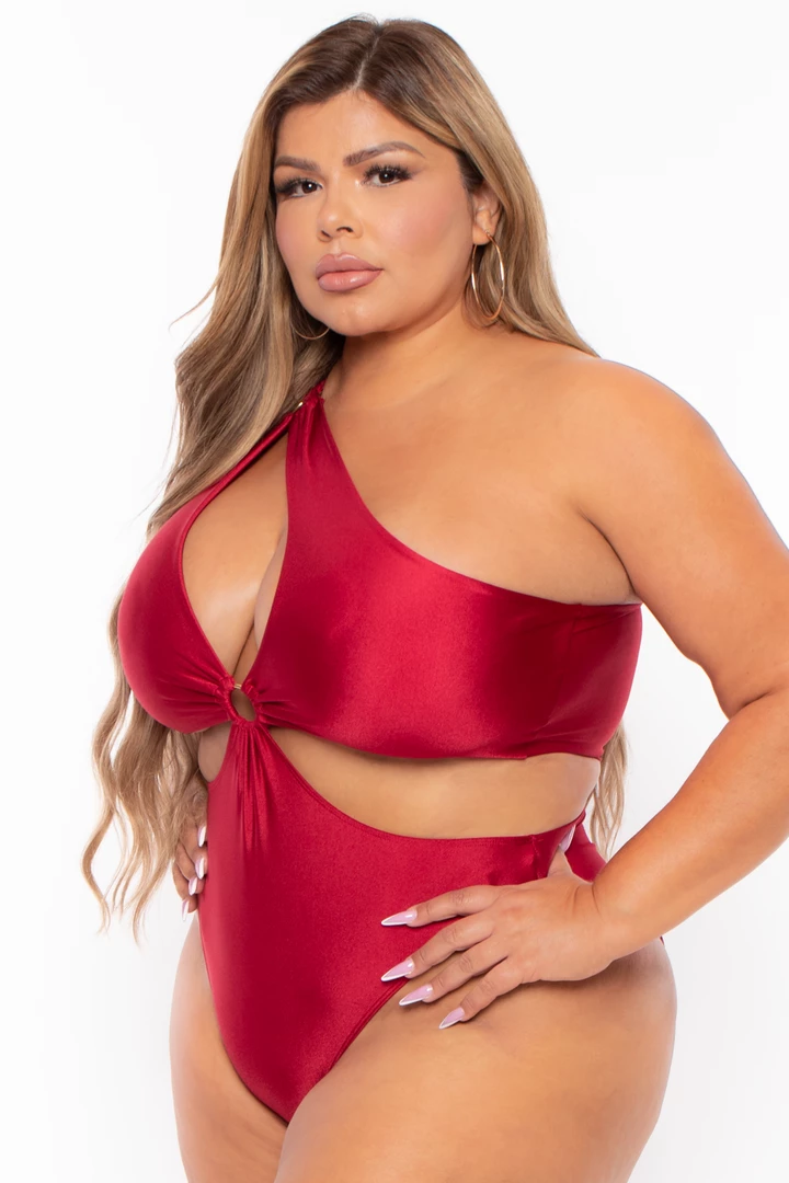 This plus size stretch one-piece suit is designed to be worn as a swimsuit but even better to wear as a bodysuit that can be dressed up from the pool to a night out this suit futures an asymmetric neckline front sexy cut-out detail with double ring hardware giving a gathering detail