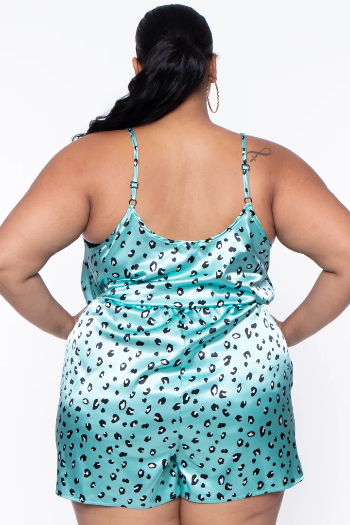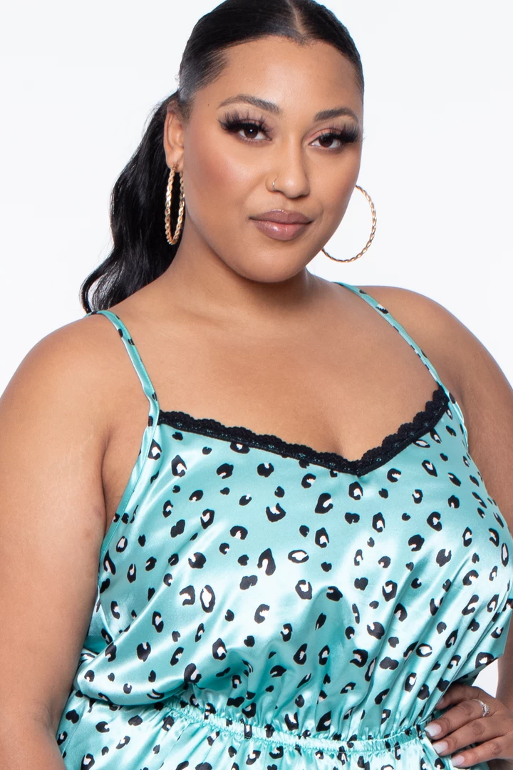 This plus size, satin woven romper features allover cheetah print, V-neckline with contrast black lace trim adjustable cami straps silky feeling texture, elasticized waist, and romper bottoms with side hem slits, sit great on the body giving a nice silhouette.