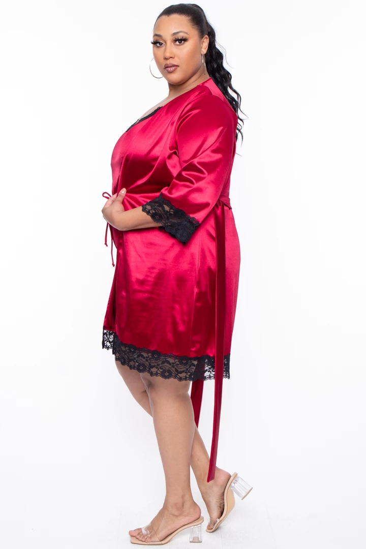 This Plus size satin robe features an open front, long sleeves with lace hem detail, a self-tie belt at waist and lace hem detail, beautiful soft satin fabric