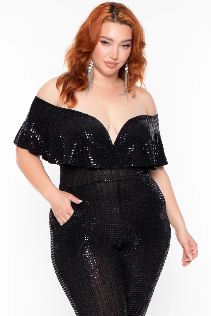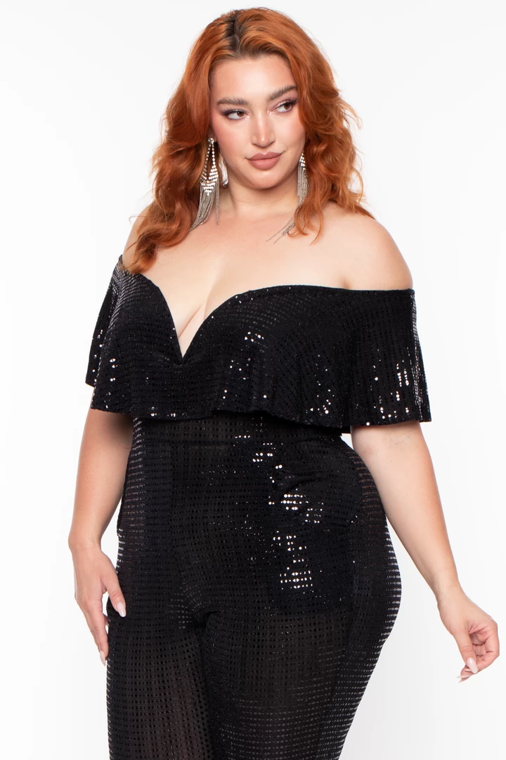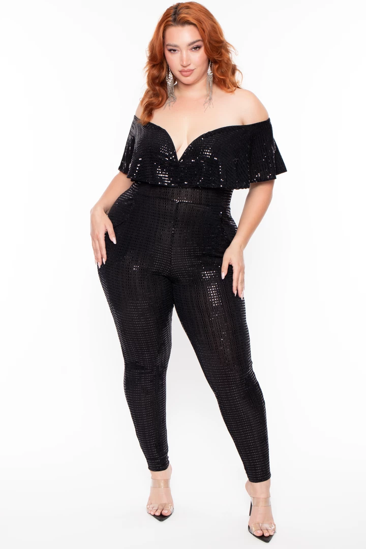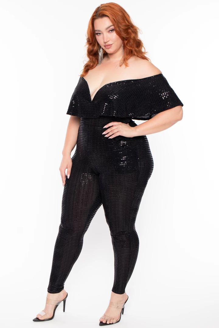 Off the shoulder sequin jumpsuit with pockets, perfect for a night out!