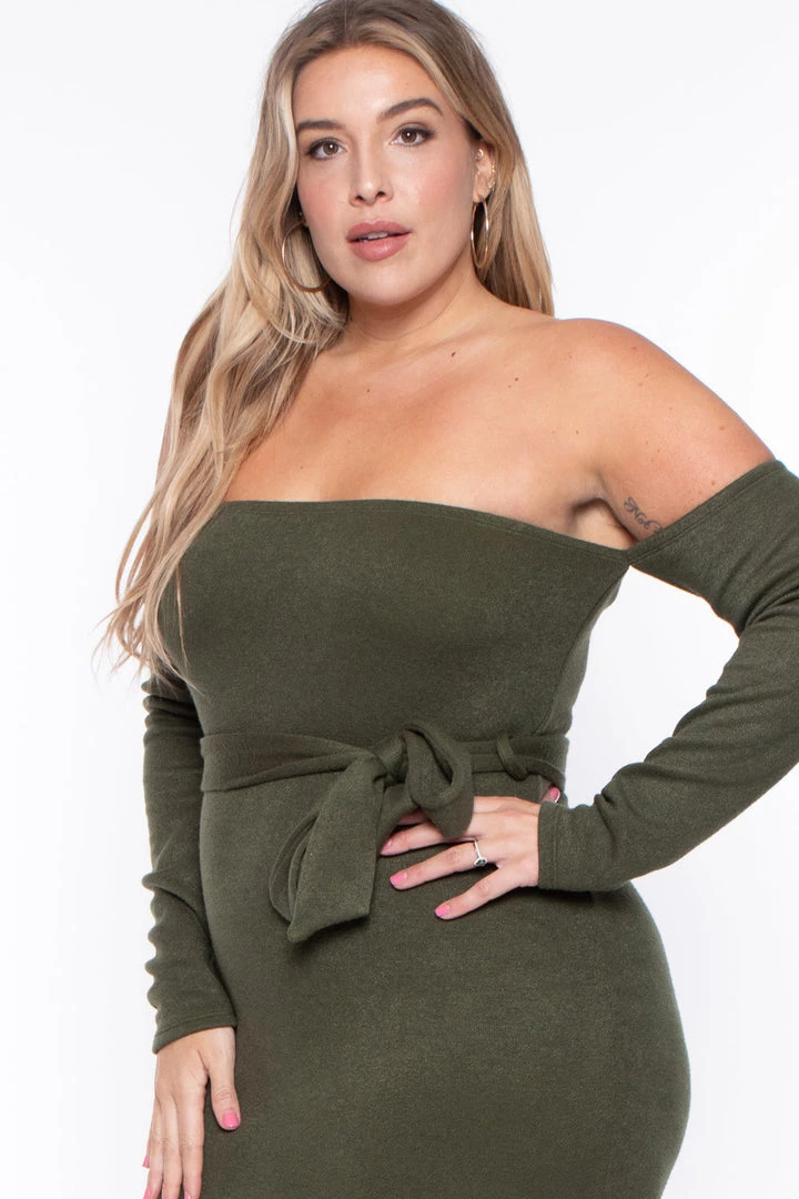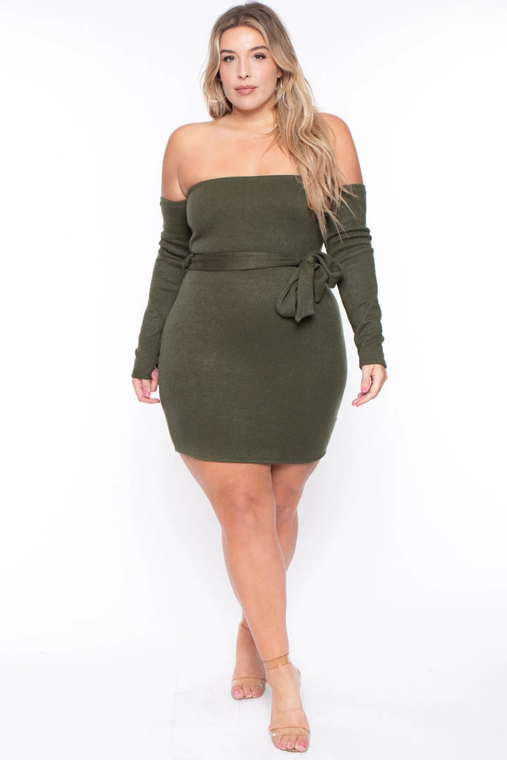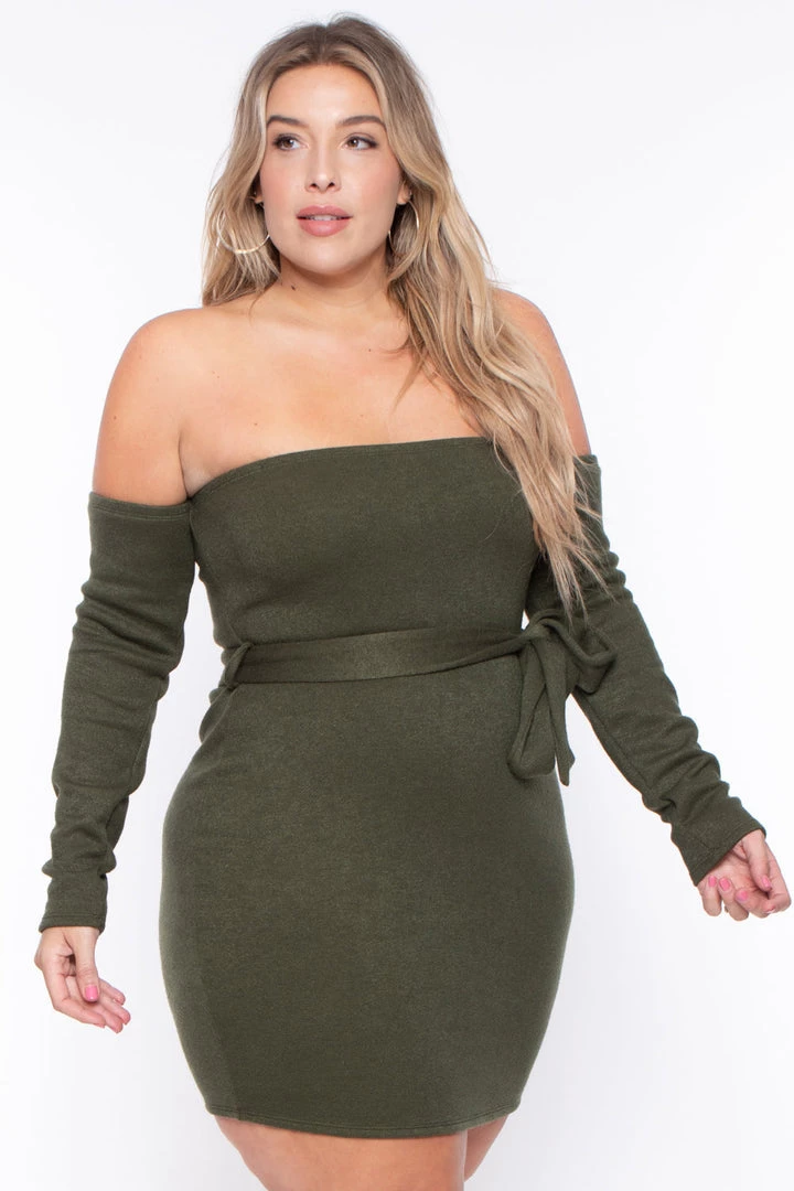 This plus size, sweater dress features an off the shoulder neckline, long sleeves, curve hugging silhouette with matching belt