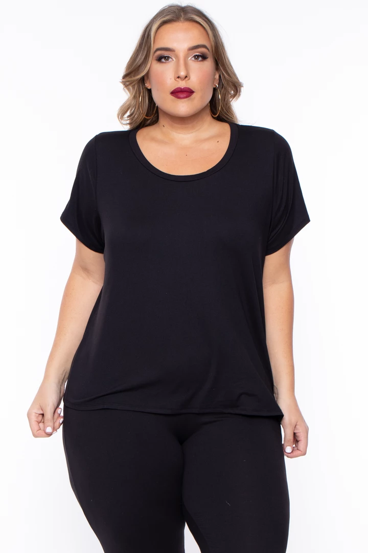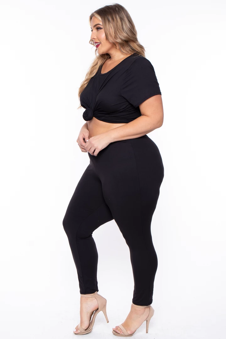 This plus size, stretch jersey knit tee and leggings set features a tee: scoop neckline, short sleeves, and a boxy cropped shape. Leggings: elasticized waist, good fit, and comfy very cute matching set