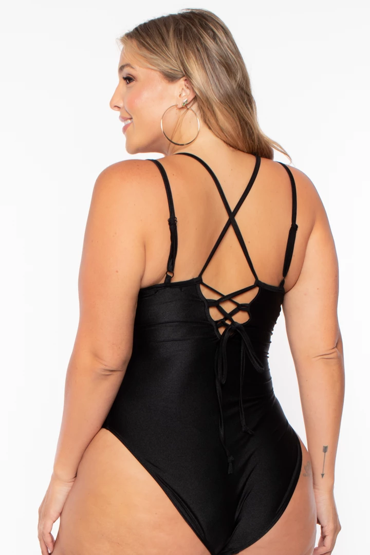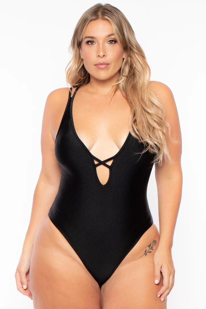 This plus size stretch one-piece suit is designed to be worn as a swimsuit but even better to wear as a bodysuit that can be dressed up from the pool to a night out this suit futures a plunging neckline with a keyhole detail adjustable cami straps and back criss-cross detail turning in to a lace-up detail