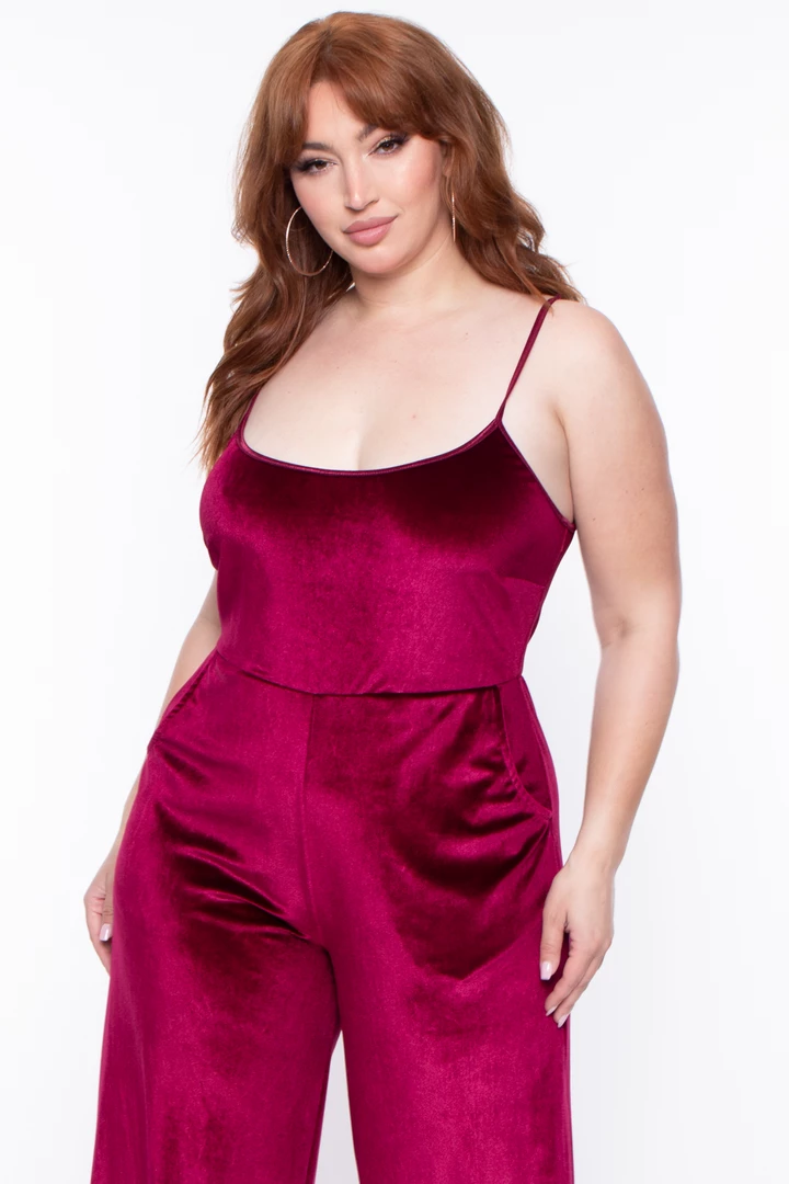 This plus size, stretch knit jumpsuit features a sleeveless design, a low round neckline with adjustable cami straps for and added comfort, and elastic waist and flared legsÂ