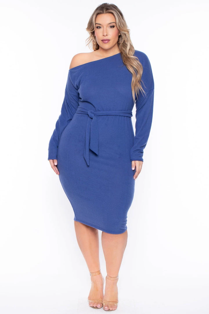 This plus size, dress features an asymmetric off the shoulder neckline, long sleeves, a tie sash and curve hugging silhouette made with soft light brushed knit material