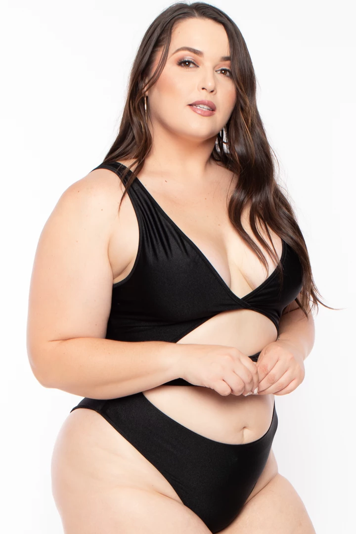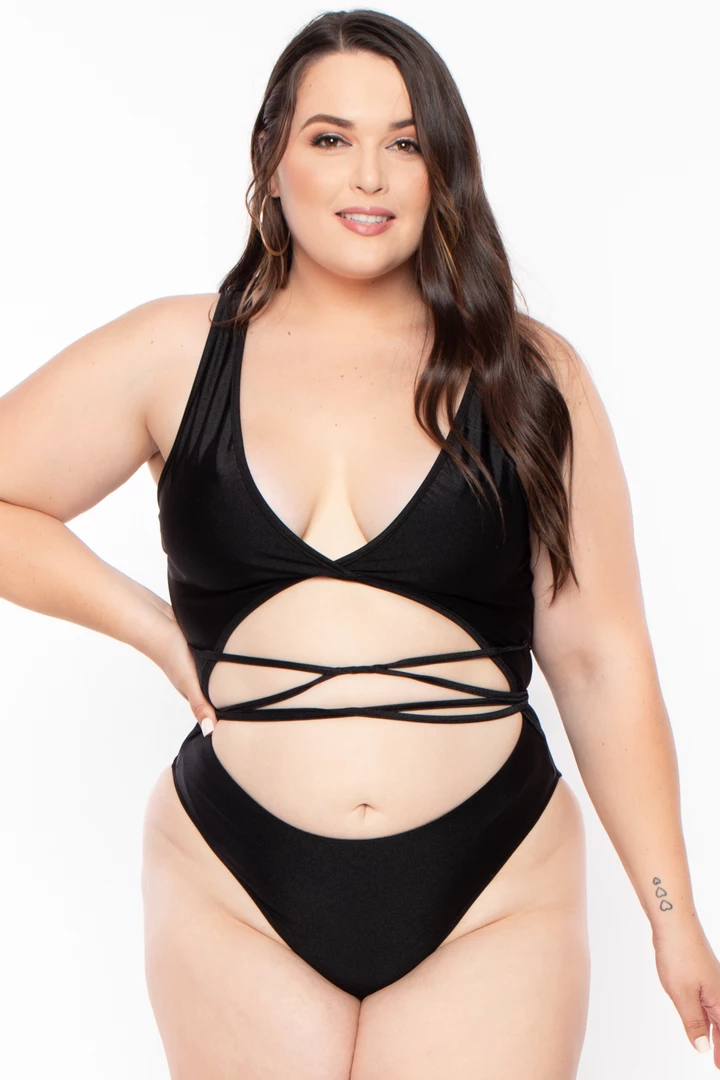 This plus size stretch one-piece suit is designed to be worn as a swimsuit but even better to wear as a bodysuit that can be dressed up from the pool to a night out this suit features a plunging neckline with back dropped neckline front cut-out. and front to a lace-up detail