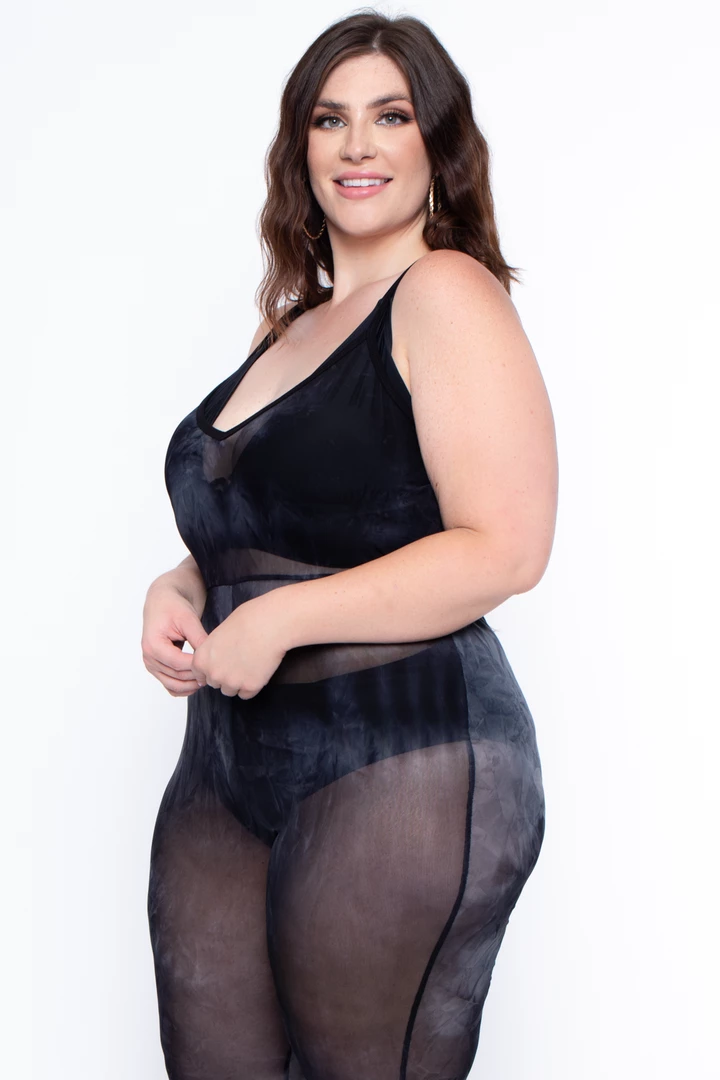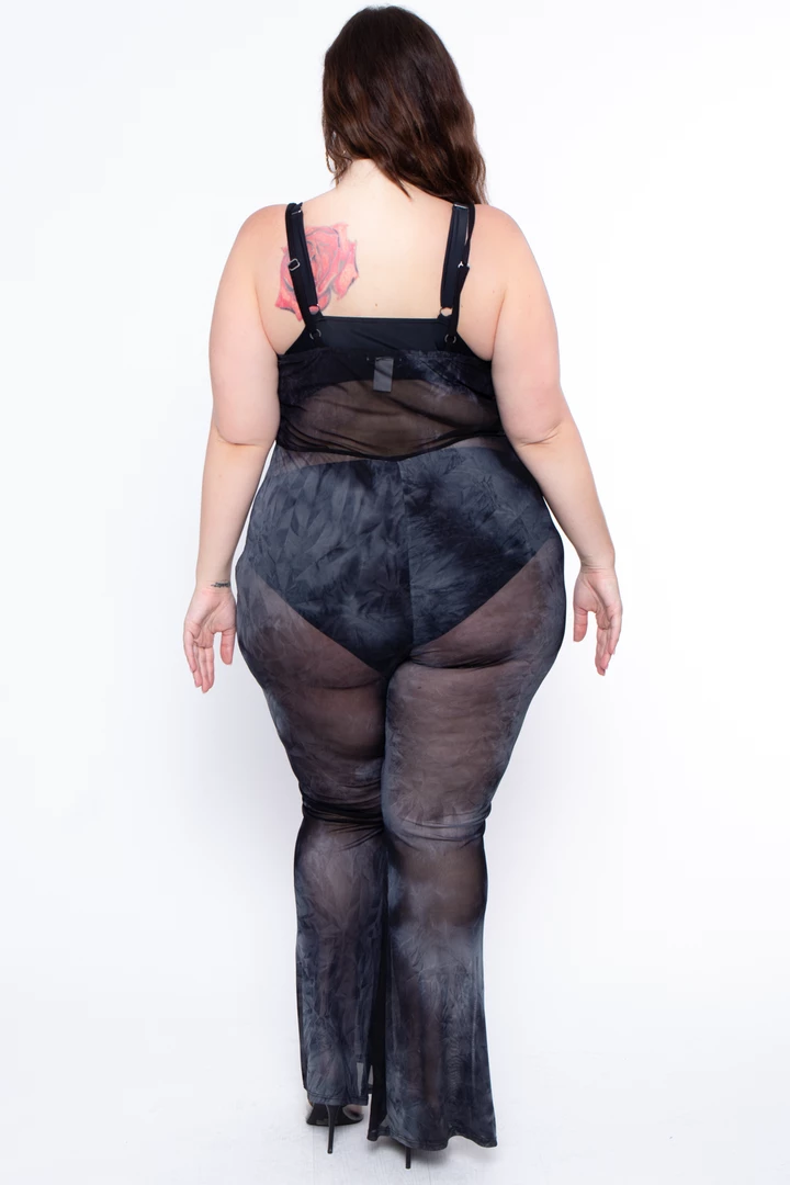 This plus size, stretch knit mesh coverup jumpsuit features a V-neckline, sleeveless cami adjustable straps elasticized waist flare legs and Tye-dye print all over perfect for and after pool dinner