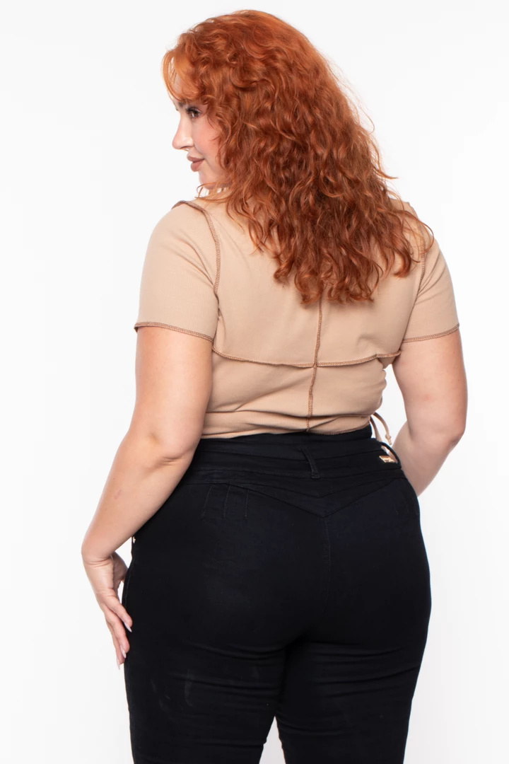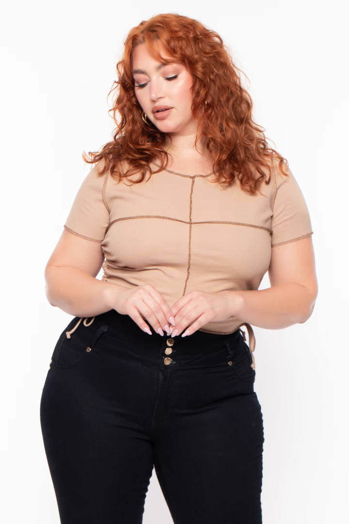 This plus size, casual top is perfect to pair with some jeans. Adria features adjustable side ruching details, cross shaped overlock hem detailing and short sleeves