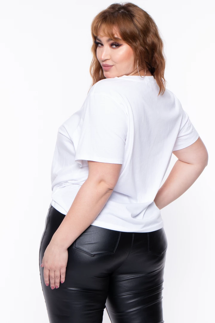 This plus size, stretch knit top features a crew neckline, short sleeves, semi cropped length, and “Blondie” Graphic logo