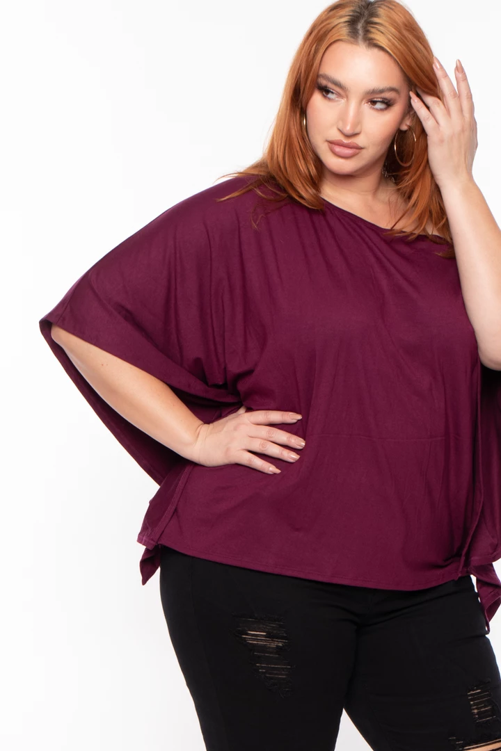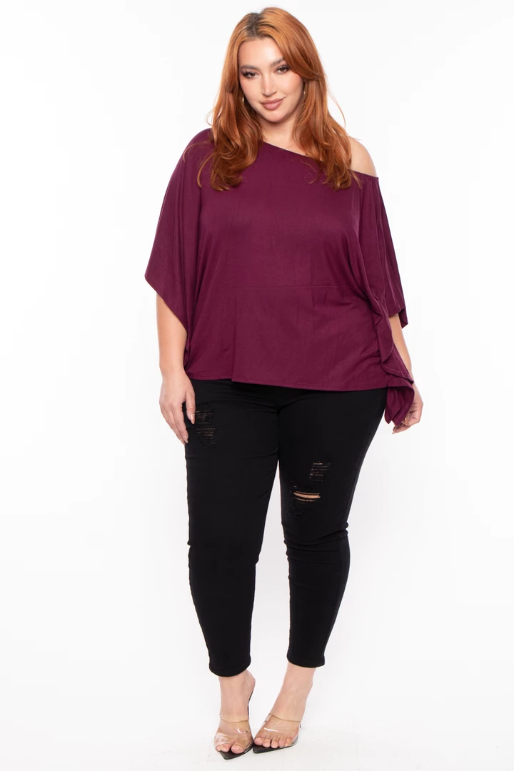 This plus-size, woven top features an off-the-shoulder neckline with an elasticized band, boxy seam sleeve pleating and drape, and a flared bottom hem