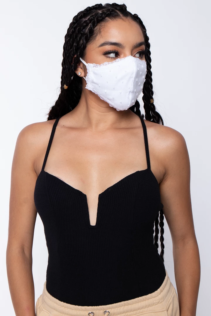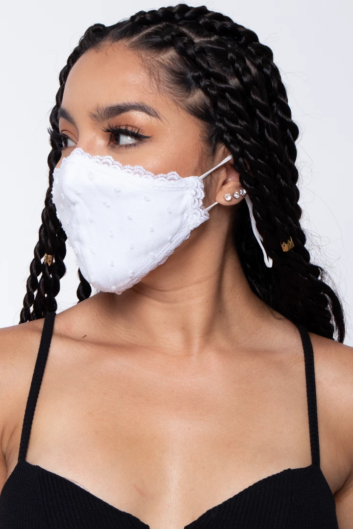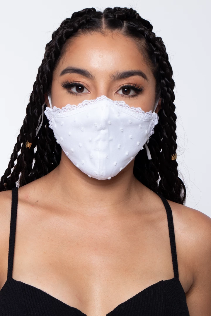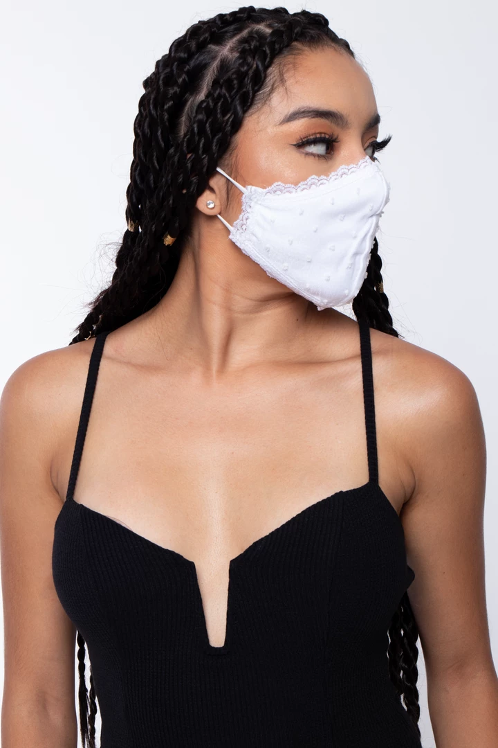 This washable and reusable unisex mask is made of a lace outer layer and dual-layer soft cotton-spandex jersey material that makes it comfortable and breathable. The stretch bands make them stretch so that they fit faces of all sizes. Embroidery on the left side of the mask.