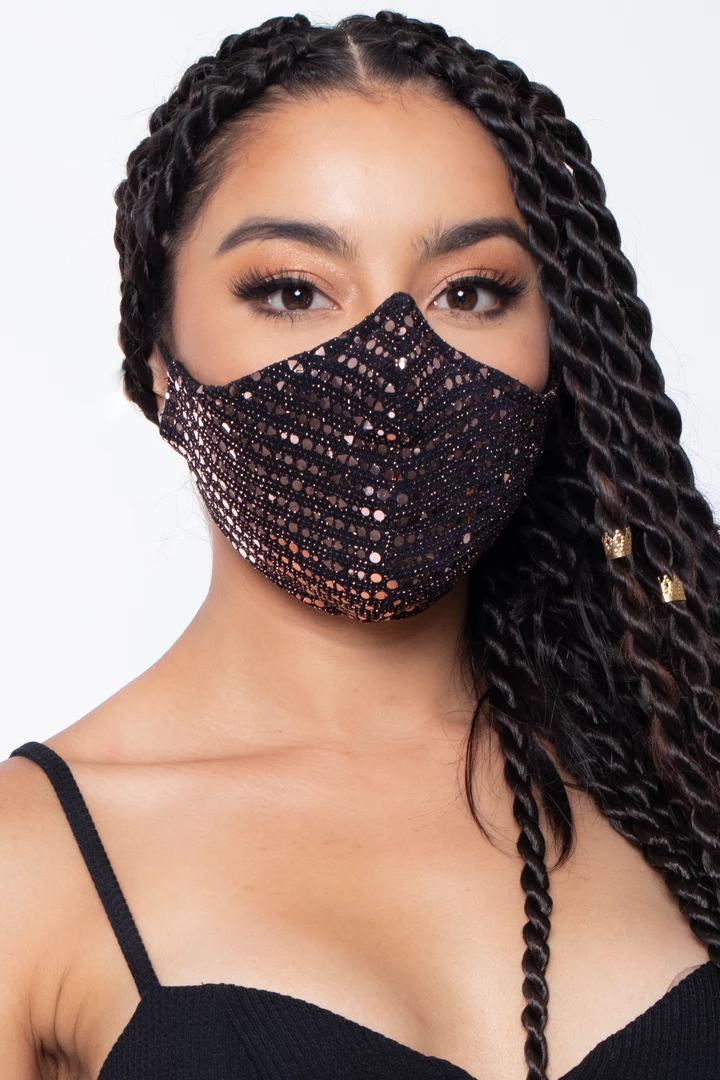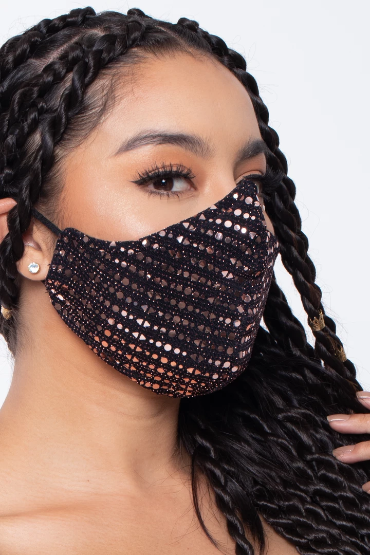 This washable and reusable unisex mask is made of a sequins outer layer and soft cotton-spandex jersey material that makes it comfortable and breathable. The stretch bands make them stretch so that they fit faces of all sizes. Embroidery on the left side of the mask.
