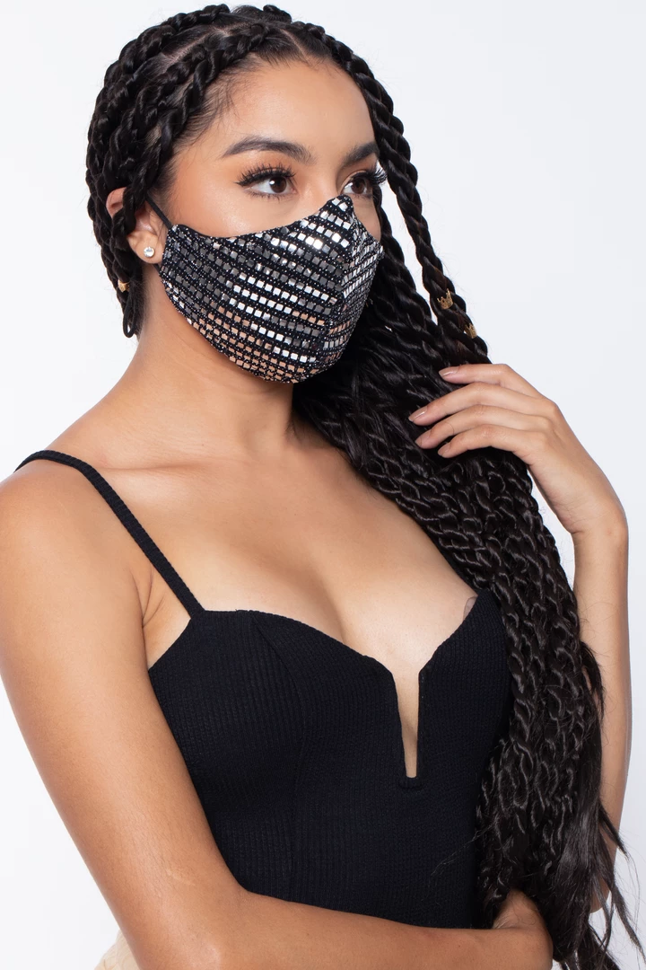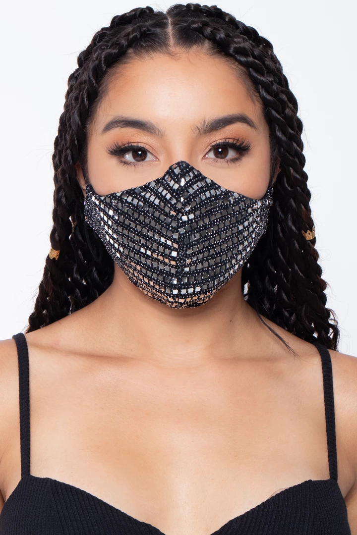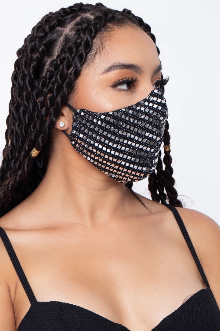This washable and reusable unisex mask is made of a sequins outer layer and soft cotton-spandex jersey material that makes it comfortable and breathable. The stretch bands make them stretch so that they fit faces of all sizes. Embroidery on the left side of the mask.