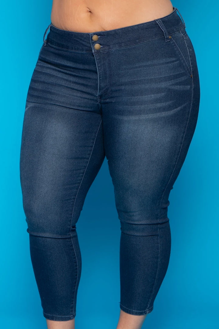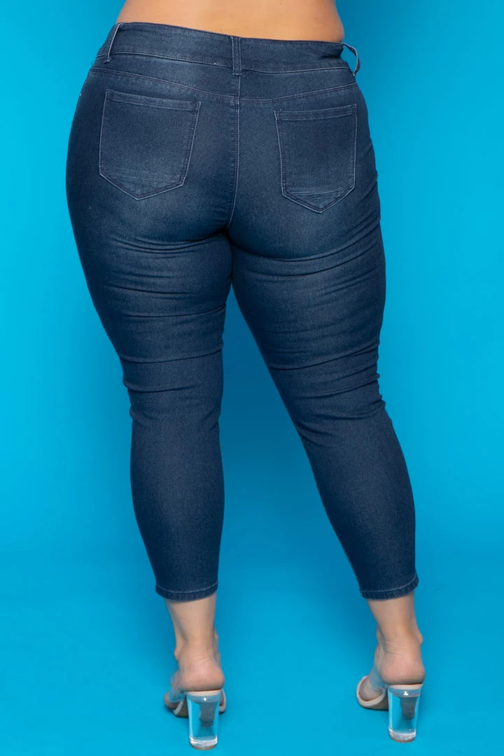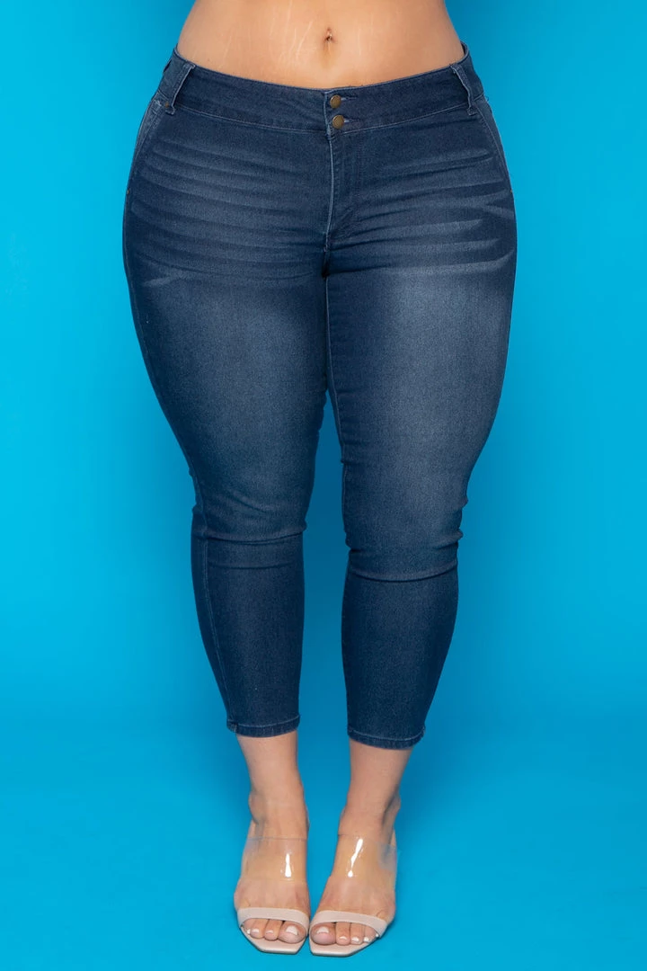 This plus size, medium wash jeans features comfort stretch, skinny ankle cut, 5 pocket styling with faux front pockets
