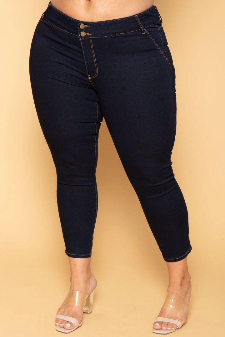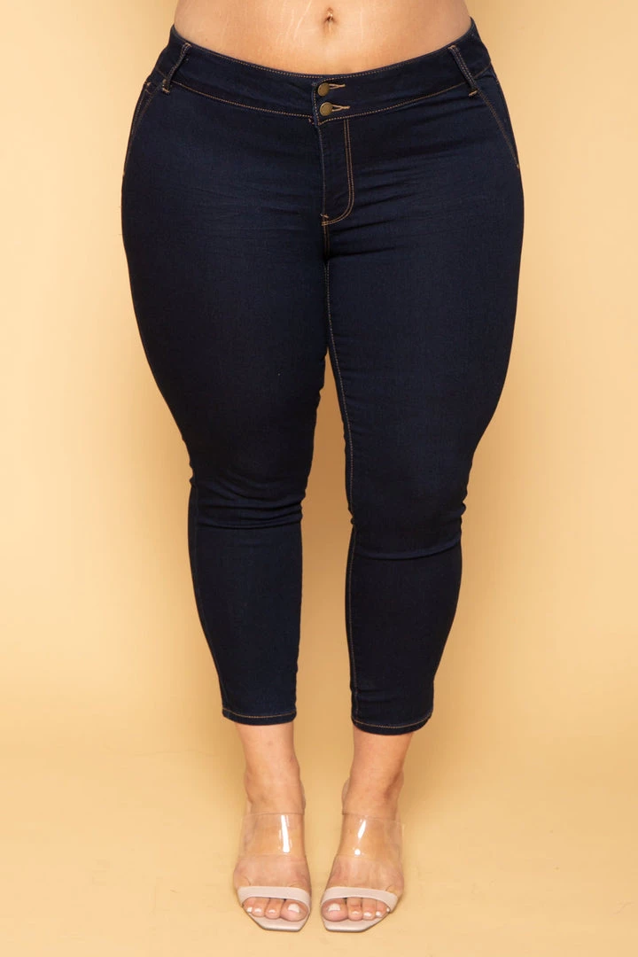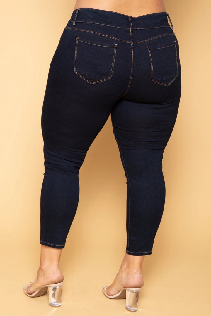 This plus size, dark wash jeans features comfort stretch, skinny ankle cut, 5 pocket styling with faux front pockets