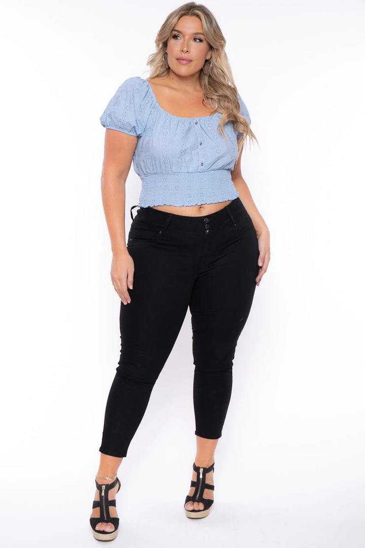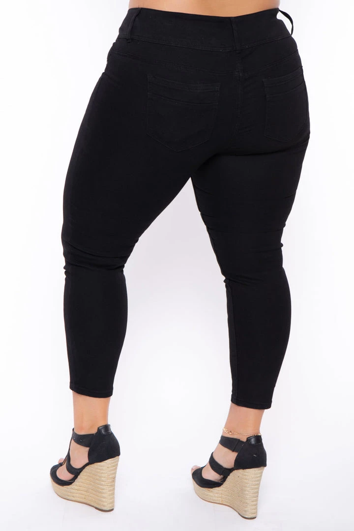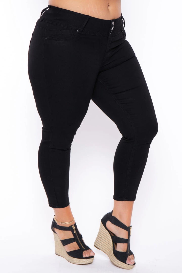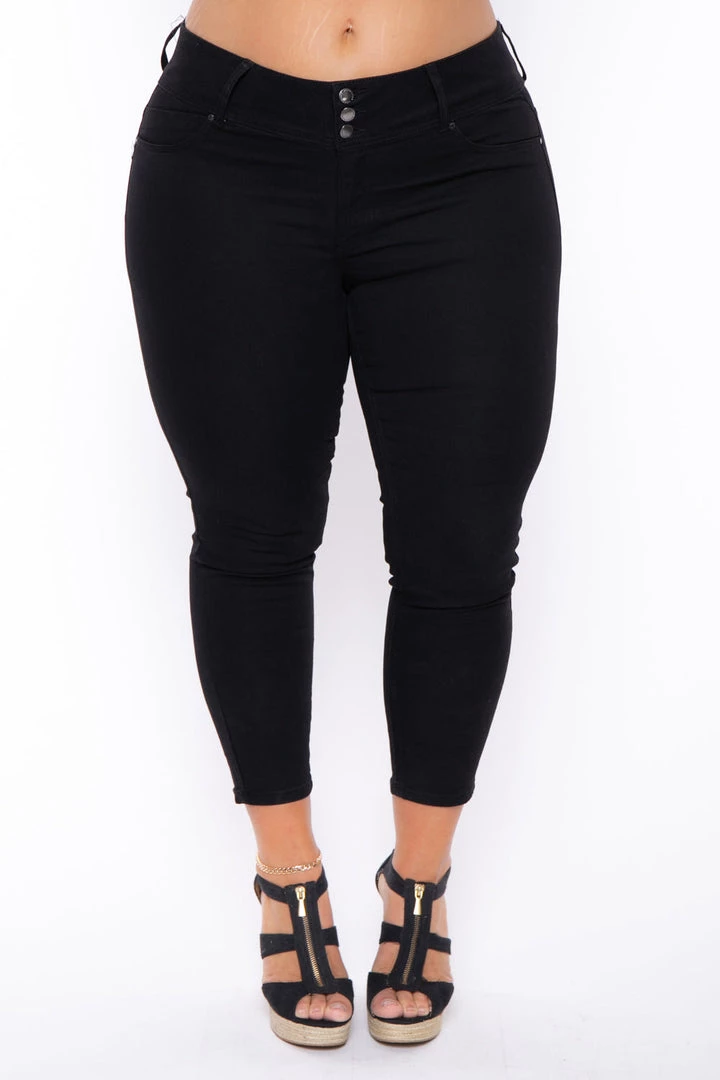 This plus size, stretch jeans features comfort stretch and a flattering fit, triple button closure, contoured waistband, skinny cut ankle and has 5 finished pocket styling with faux front pockets.