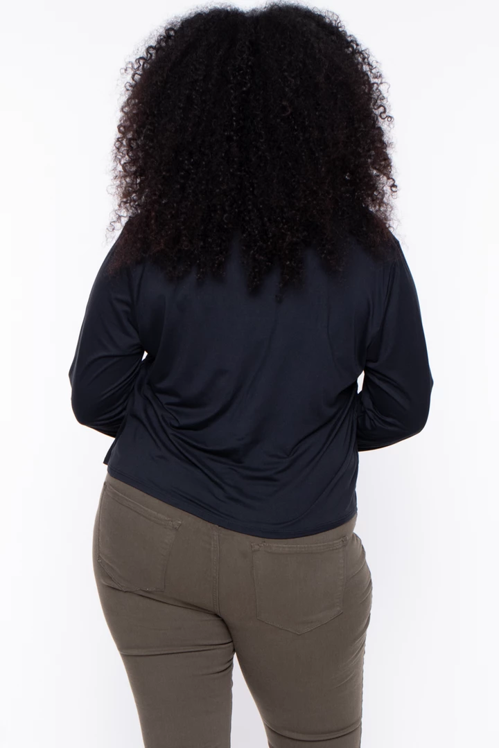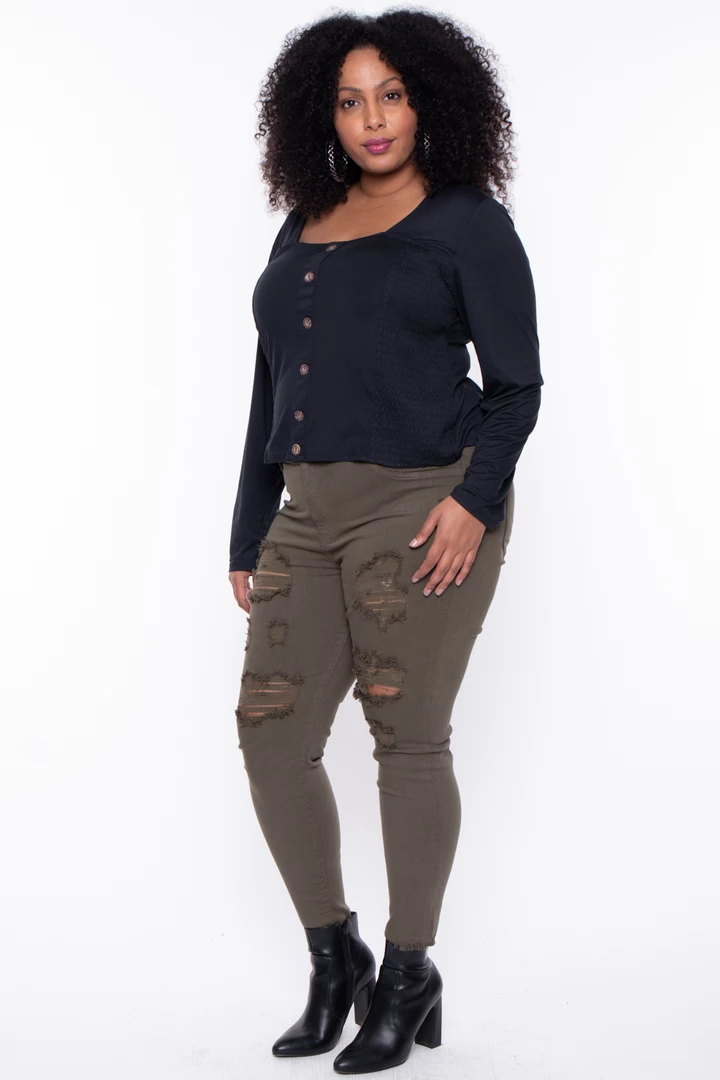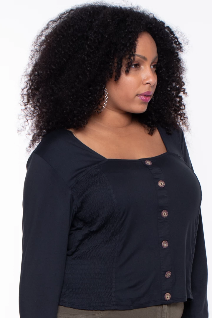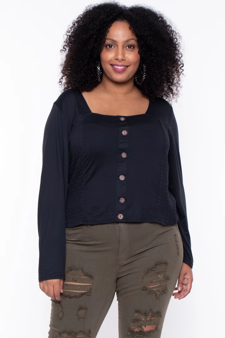 This plus size, this stretch blouse features a square neckline with a smocked side detail to the hem, long sleeves front buttons detail boxy relax fit