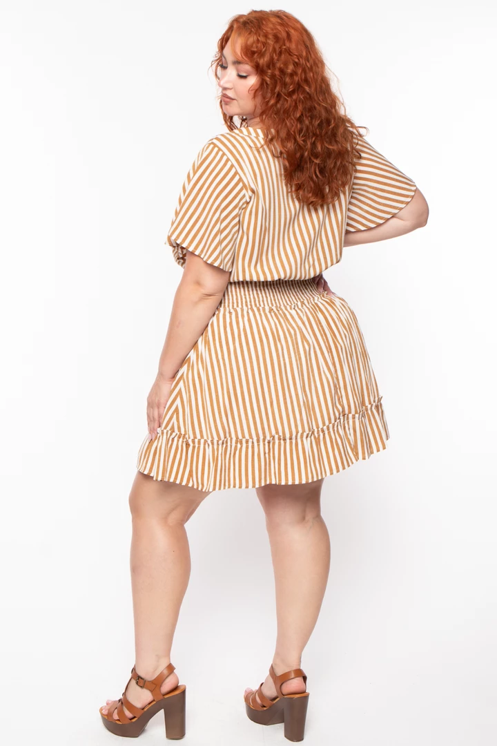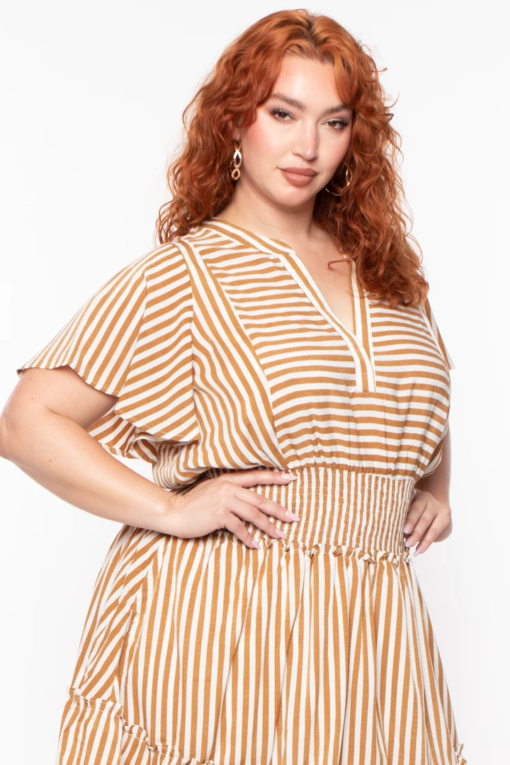 This plus size smocked dress futures a V-neckline with smocked detail at the waist flared skirt with a bottom ruffle