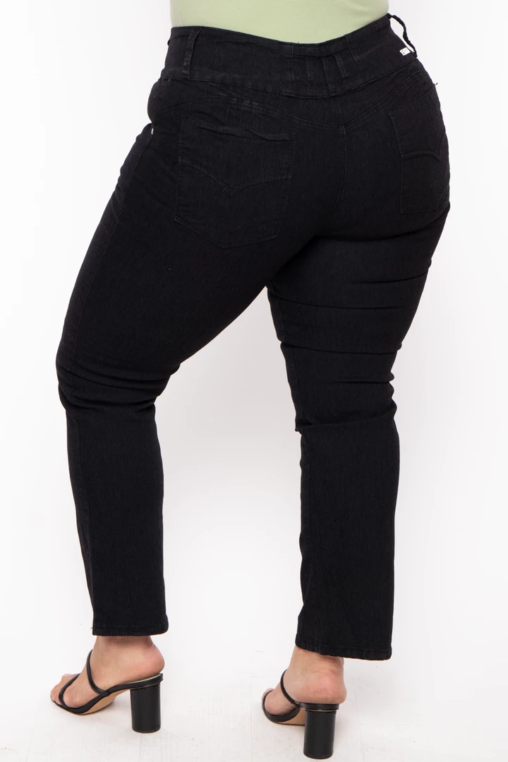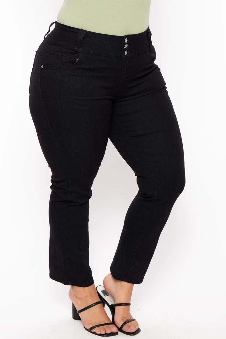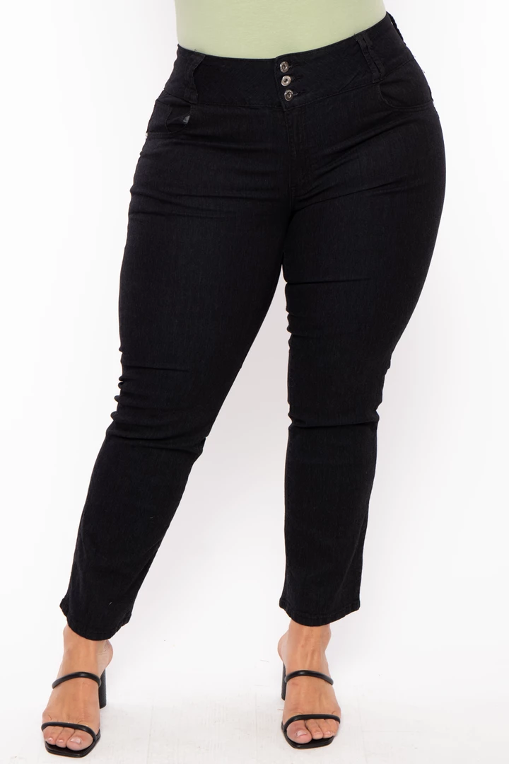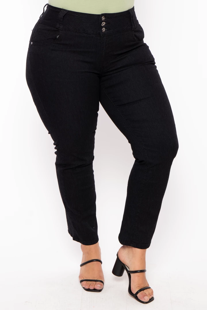 This plus size, stretchy jean features a zip fly with a high waist 3 button closure, a 5-pocket construction, a sculpted silhouette, contoured curves, comfy, cozy feel, a rounded butt overall look, push up technology that enhances your assets, and straight bottom hem
