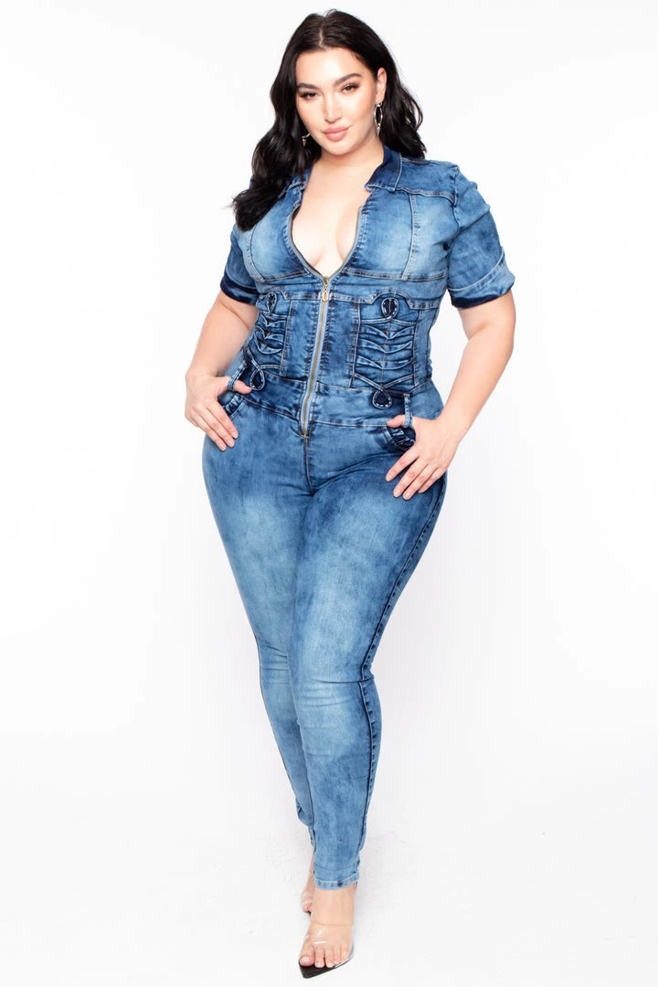 This plus size, stretch denim jumpsuit features a faded acid wash, basic collar, short sleeves with folded hem, zipper front, beautifully detailed design on waist, belt loops, ruffle-detailed faux pockets, and skinny legs