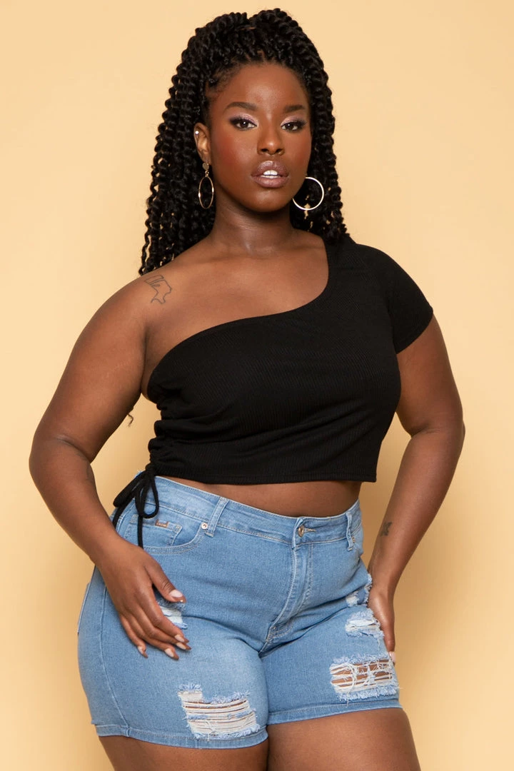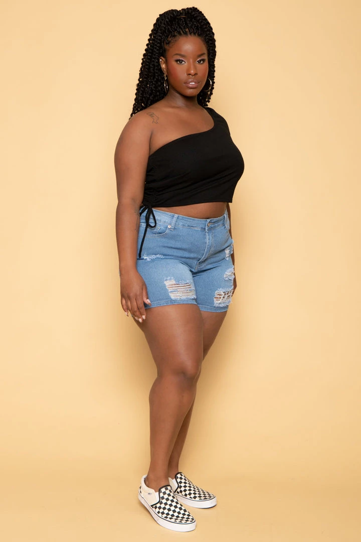 This plus size, stretch denim shorts features comfort stretch, light distressing and clean edge hem