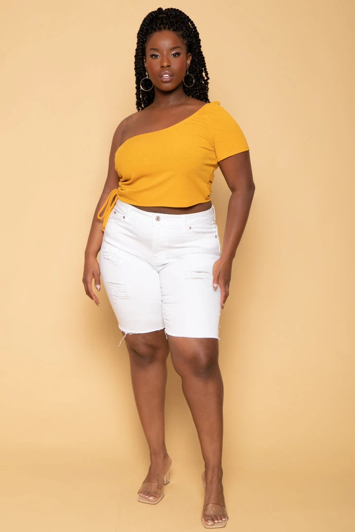 This plus size, stretch denim shorts features comfort stretch, lightly frayed hem, and light distressing