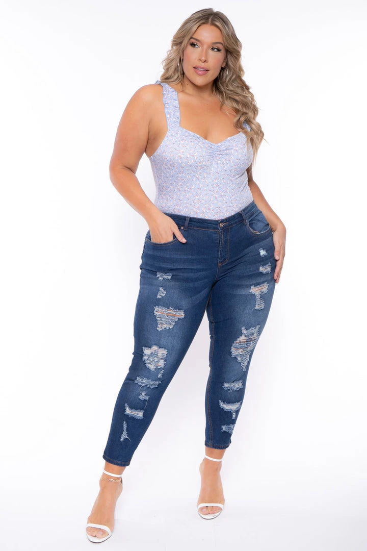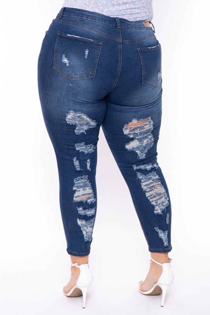 This plus size, stretch jeans from the Dollhouse Brand features great stretch and sits at the natural waist, fitted through the hips, thighs and legs. Has distressed details on the front and back of the jeans.