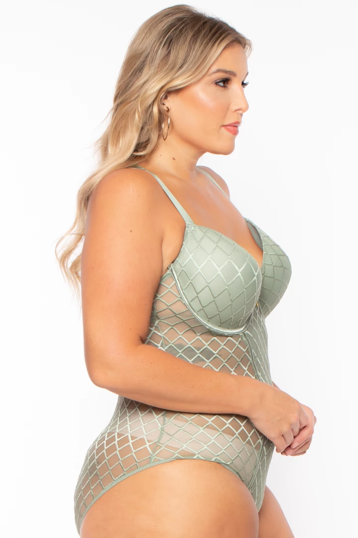 This plus size, stretch lingerie features a padded bra cup, diamonds shape lace with front nude contrast lining dual adjustable cami straps that cross hook at the back, and a snap bottom at the hem.
