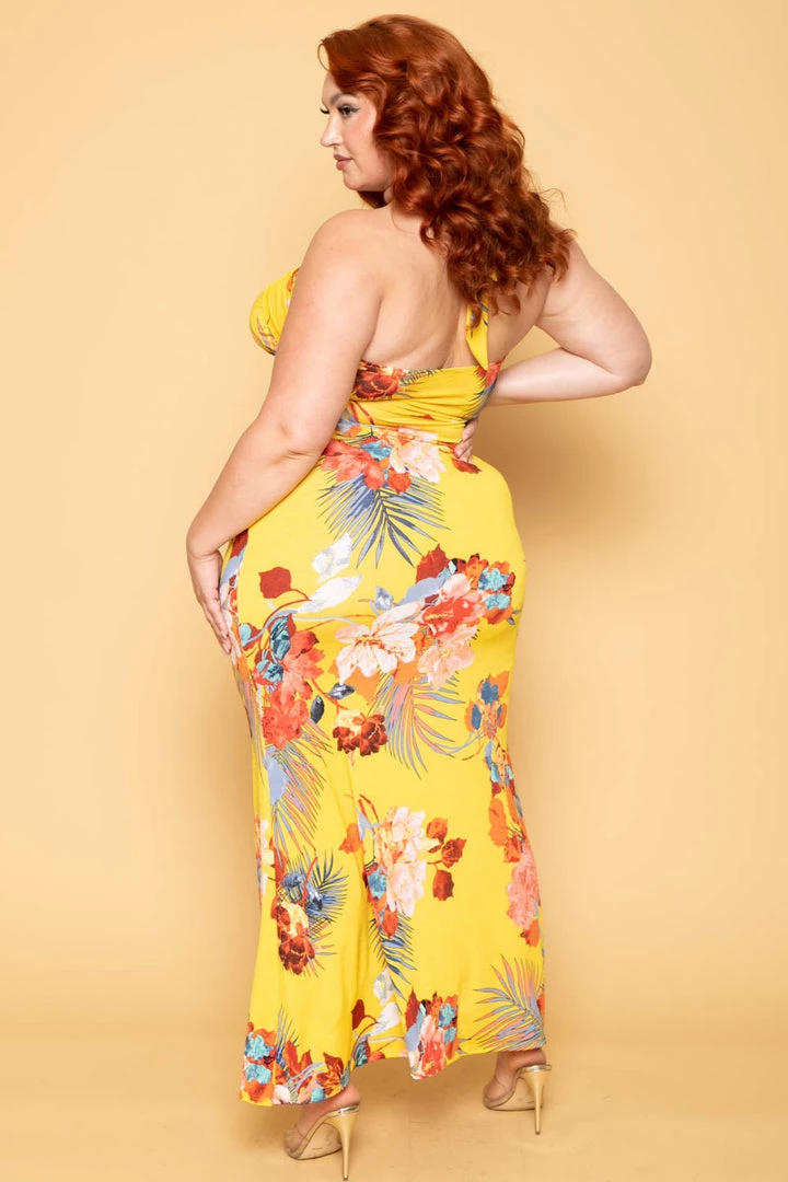 This plus size dress features an all over fun floral print, a crisscross halter neckline, sleeveless, a cinched detail at the bust, and a bodycon maxi length mermaid sillouhete.