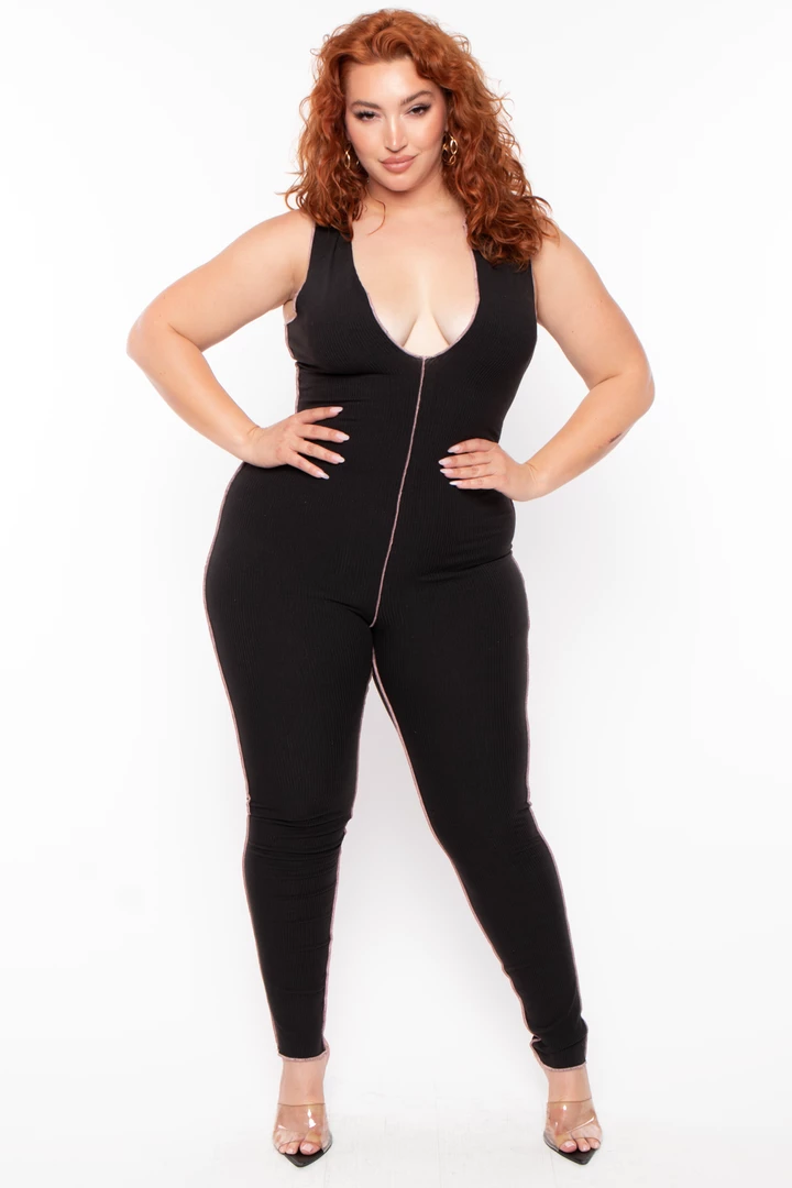 Gibiu Party Jumpsuilts Plus Size Exposed Seams Rib Catsuit – Black
