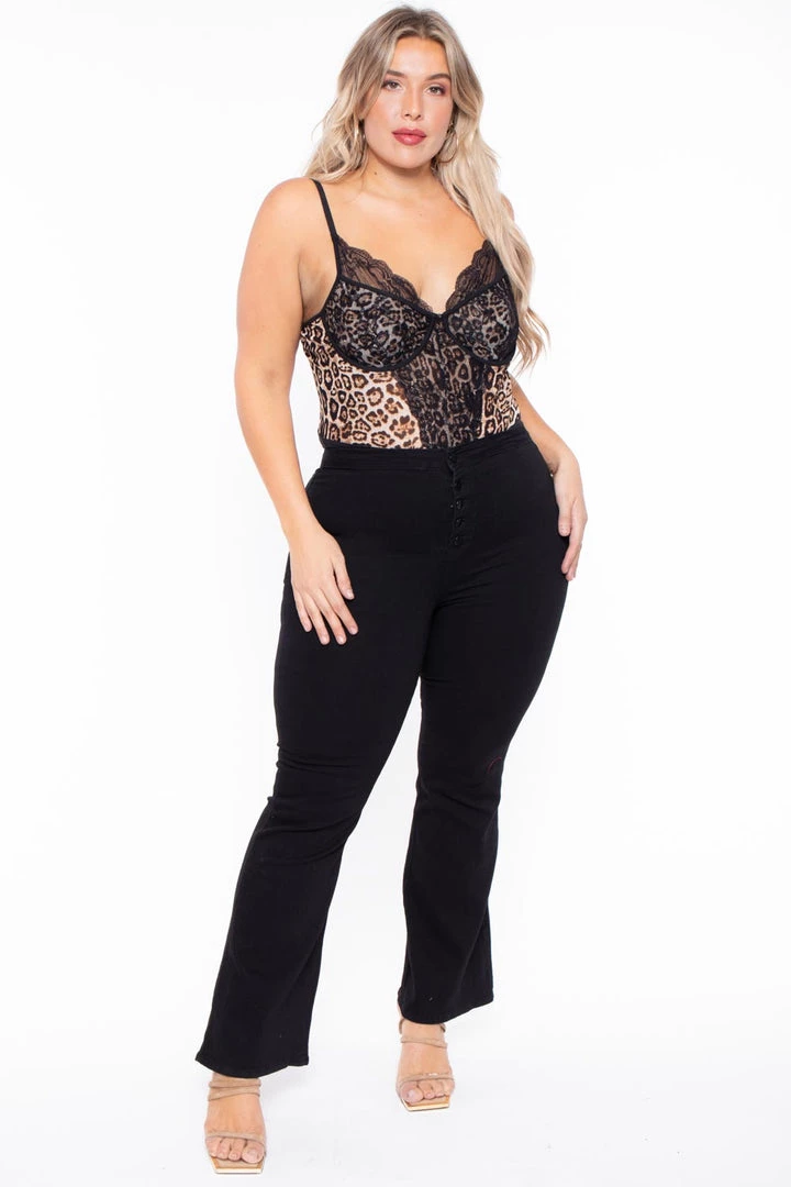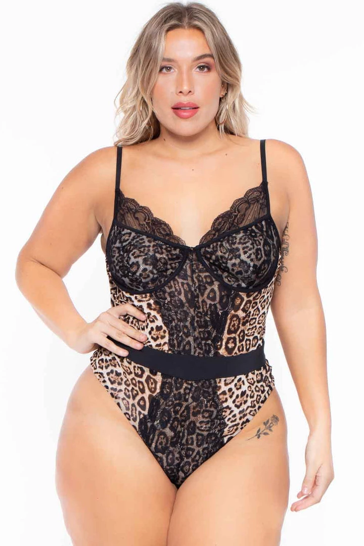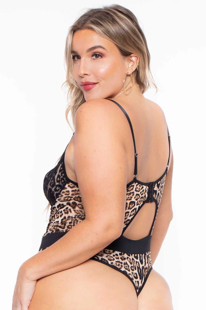 This plus size, sexy bodysuit is perfect to wear out or in. Aisha features an all over leopard print, with lace overlay detailing, thong cut, adjustable straps, and double snap closure