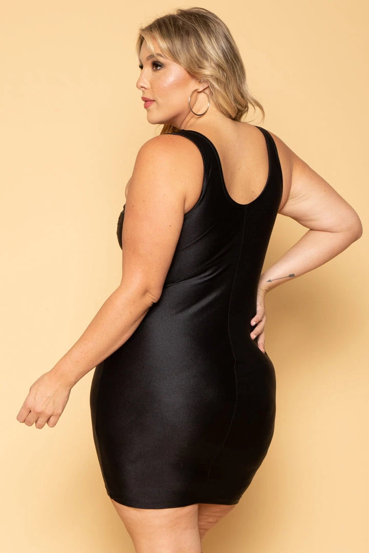 This plus size, bodycon mini dress features a curve hugging silhouette, light sheen, sleeveless, scoop neckline with a mini v detail. Perfect for a night out!