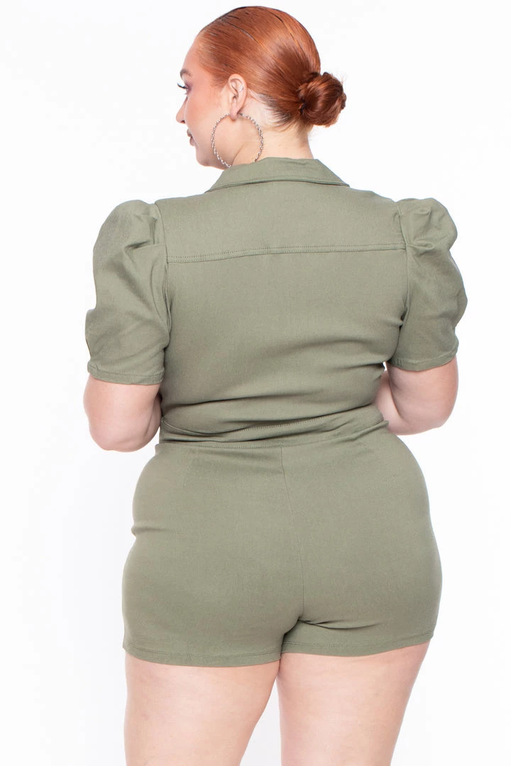 This plus size, romper is perfect to dress up or down! Ainsley features exposed zipper front detail, puff short sleeves, curvy hugging silhouette, 2 front pockets and metal stud detailing
