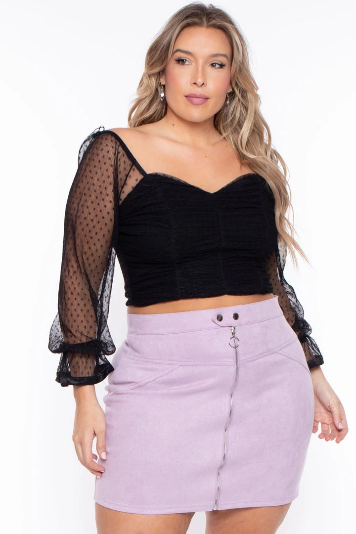 This plus size, mini skirt features vegan suede material with center front zipper, double metal clasp ,and curve hugging silhouette