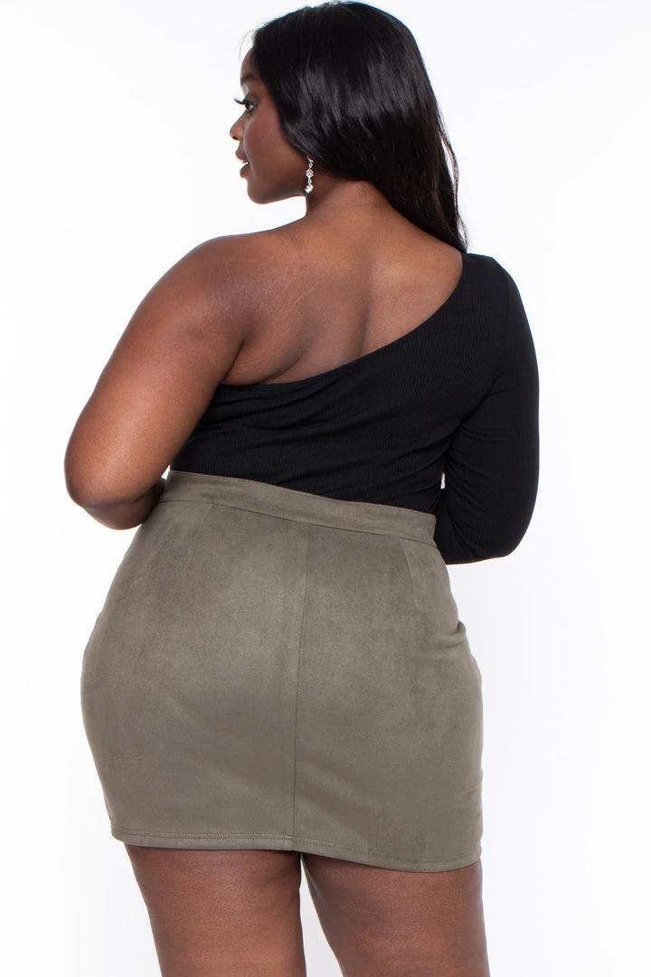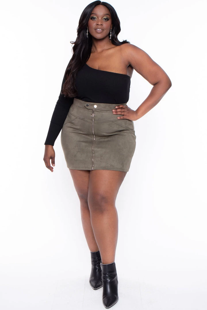 This plus size, mini skirt features vegan suede material with center front zipper, double metal clasp ,and curve hugging silhouette