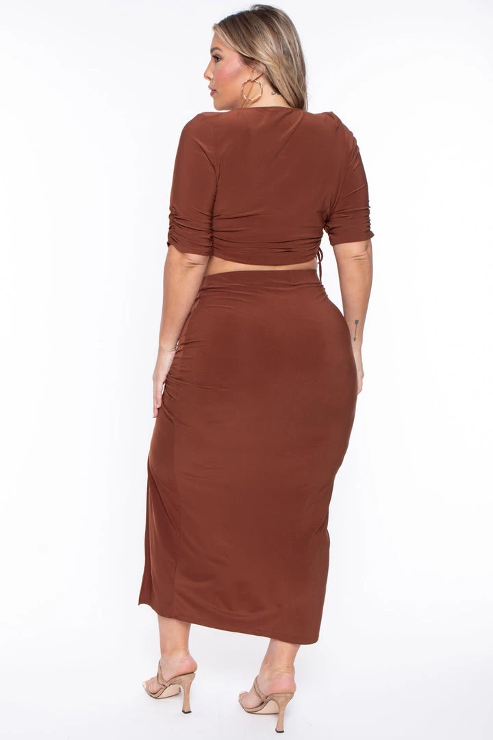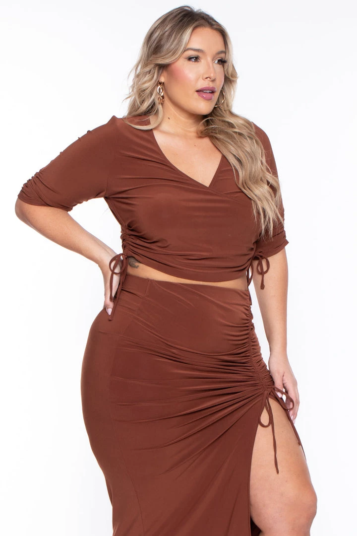 This plus size, matching set features ruched sleeves and deep v neckline. The skirt has an adjustable ruching detail for a high or low slit